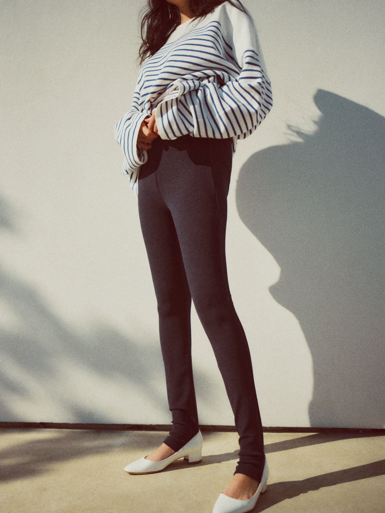 レギングを、THE NEWHOUSEらしいアプローチでリブートした大人気レギングがカムバック!一枚のボトムとして着ることができるROW LEGGINGに今シリーズは新色ネイビーが仲間入り。一番の特徴は、ニットのようなホールド感のある生地。ふっくらとした厚みがあるのでインナー感がなく、ボトムとして使いやすくなっています。また、肌あたりはソフトで滑らか。身体の動きを制限しない、よく伸びるレギングの魅力はそのままです。さらに、ブランドネームはプリントに、品質表示のタグはシールになっており、着たときのストレスを一切排しました。例えば、旅先のホテルの部屋から、コーヒーを買いに行くとき。そのまま足を伸ばしてショッピングへ行ったり、ふいに連絡があって友人と会ったりするのも旅の楽しみ。そんな私たちの自由で気ままなスケジュールに、寄り添ってくれるアイテムです。