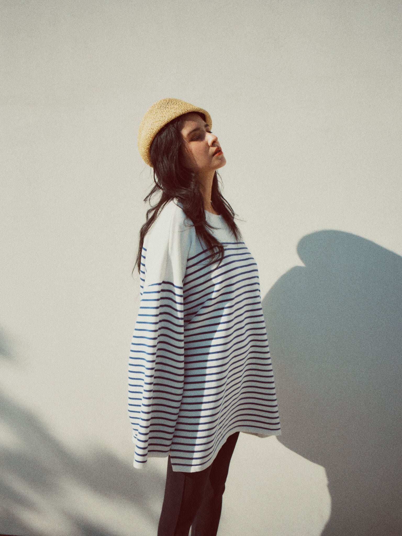 プレイフルなカラーパレットが、マインドまで明るく。大人の毎日をエナジャイズしてくれる・AYLMER LONG SLEEVEが誕生です。王道のバスクシャツを、THE NEWHOUSEらしく着心地にこだわり、コットンニットで仕立てました。カットソーのように見えますが、柔らかな素材感と美しいドレープはニット生地ならでは。それを活かし、ミニドレスのようなワイドサイズにしています。注目は、見ているだけで楽しくなるほどのカラーの豊富さ!王道のブルー、レッドに加え、まるでクロード・モネの絵画を思わせるようなパステルがかったミントグリーン、ラベンダー、イエローなど、全6色をご用意しました。お気に入りの一枚を選ぶのも良し、色違いで揃えるのも良し。ベースがオーセンティックなバスクシャツなので、古びることなく着続けていただけるアイテムです。クローゼットにも、スタイルにも。ブライトなシーズンの到来を告げる、ロングスリーブをぜひ手に入れて。