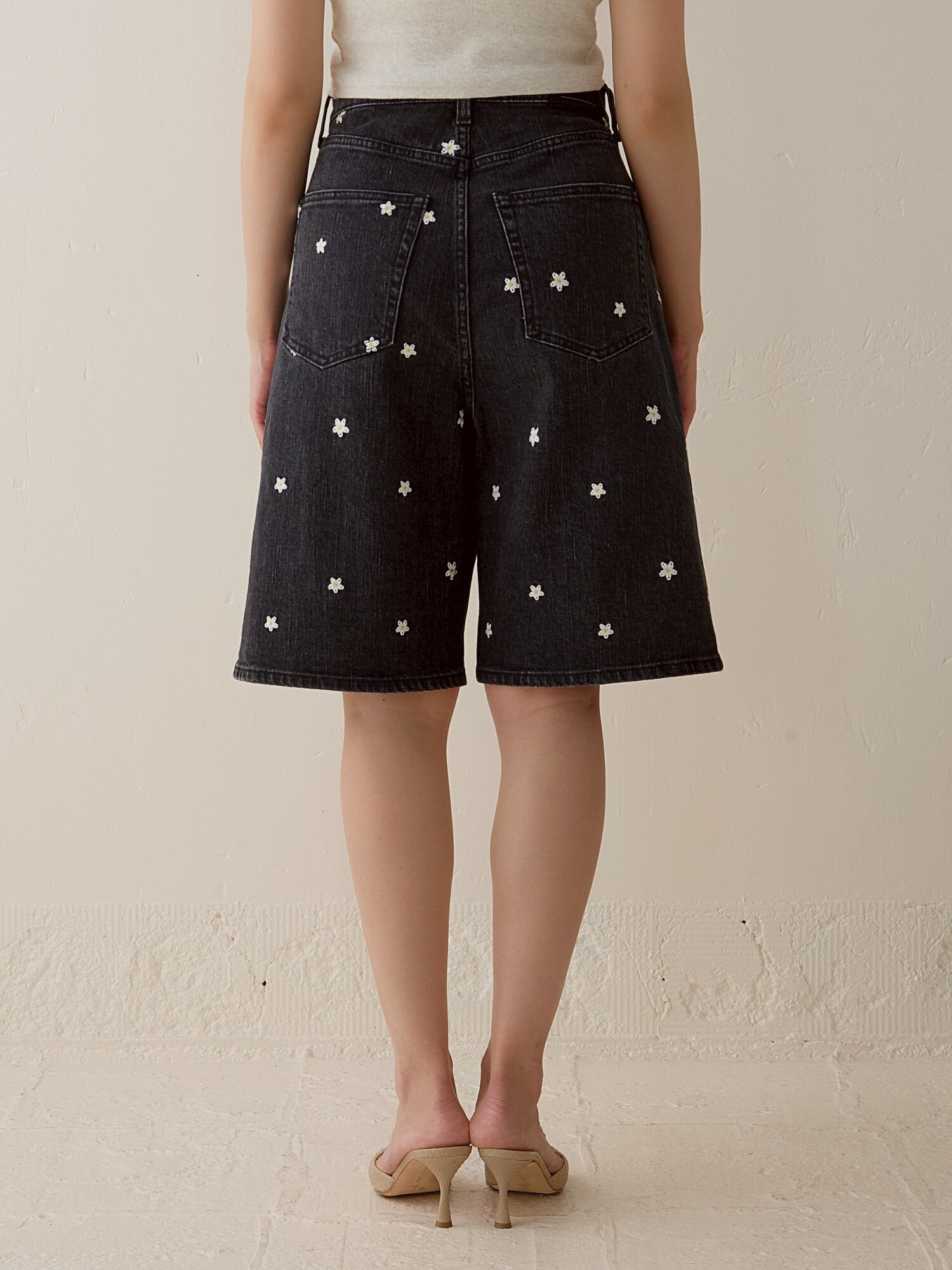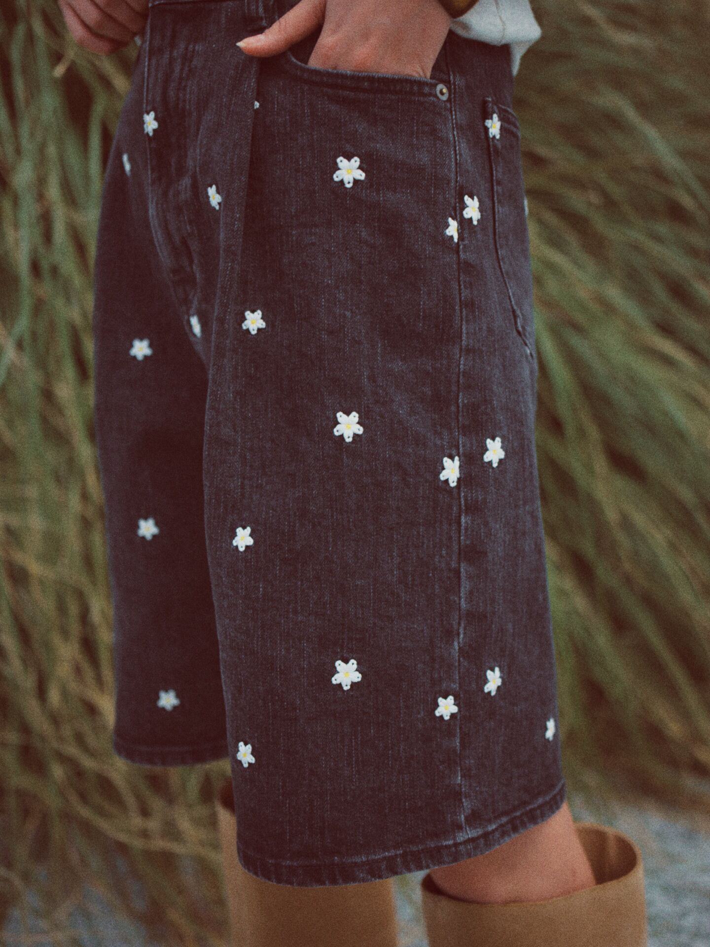 THE NEWHOUSEが自信を持ってお届けするのは、この夏のスタイリングに欠かせないItなデニムショーツ。散りばめられた手刺繍風のデイジーに、大人の遊び心を託して。程よい厚みを持つ12.5オンスのデニム地は、ストレッチが効いて快適なはき心地。あえてはき込んだような加工を施しさらに柔らかく、こなれた印象にしています。ポイントは、デニムパンツの定番である5ポケット型をベースにしながら、前面にプリーツを入れた点。ウエスト部分はきちんとフィットしつつ、フェミニティの香るバギーなシルエットに仕上がっています。デイジーの刺繍のおかげで、コーディネートの主役になるだけでなく、外しとしても活躍してくれます。ぜひアクセサリー感覚で、サマースタイルに取り入れてみて。足元にトレンドのフラットシューズを合わせれば、フレアが際立ちキュートな印象に。ミュールなどのヒールのあるシューズに合わせれば、脚をきれいに見せてくれます。ボーイッシュなだけでは満足できない、大人のためのバギーショーツです。