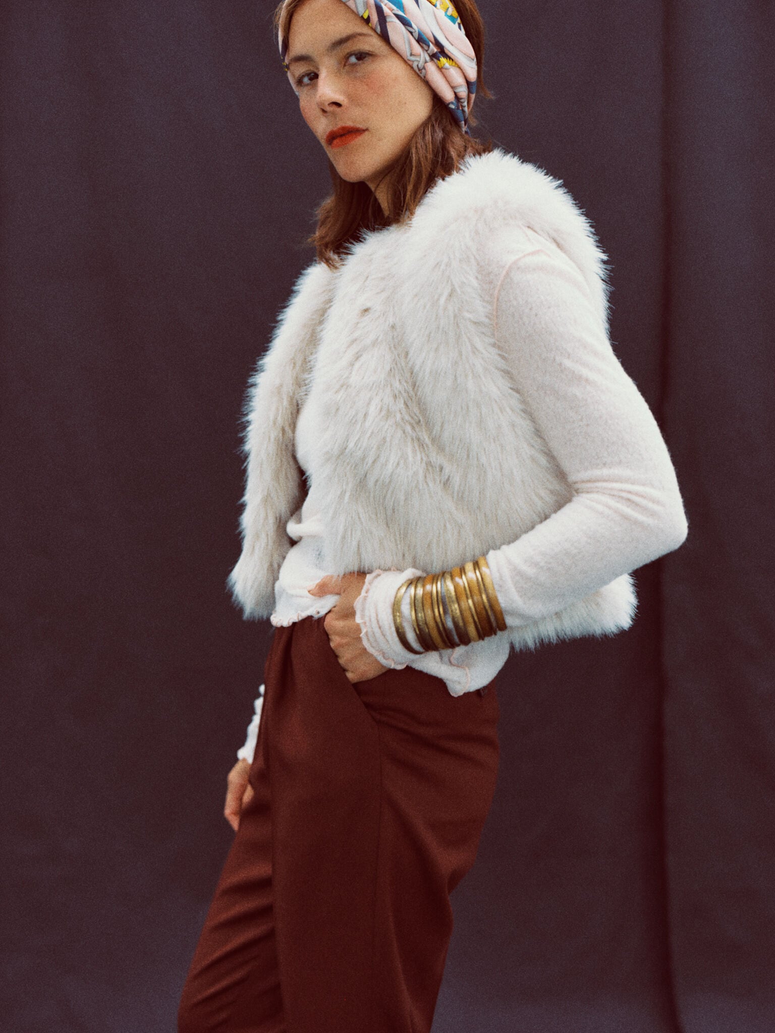 一目見て気分まで上がる、キュートなファーベスト。ポリエステル100%のエコファーは、毛足の長さや色合いにいたるまでリアルさを追求。コンパクトな丈感なので、トップス感覚で気軽に着られます。ニットやロングスリーブの上に着るのはもちろんのこと、端境期にハーフスリーブやタンクトップと合わせれば、手軽に秋冬のムードをプラスできます。フックを留めて着れば、また違った雰囲気を楽しめます。ポケットが付いているのも、嬉しいポイント。カジュアルなワントーンコーデのスパイスに。ハンサムスタイルに甘さを加えて。テイストもボトムも選ばない、使えるファーベストです。