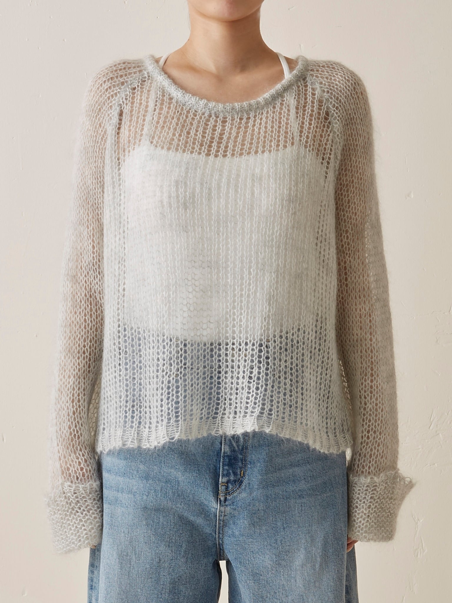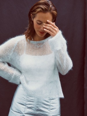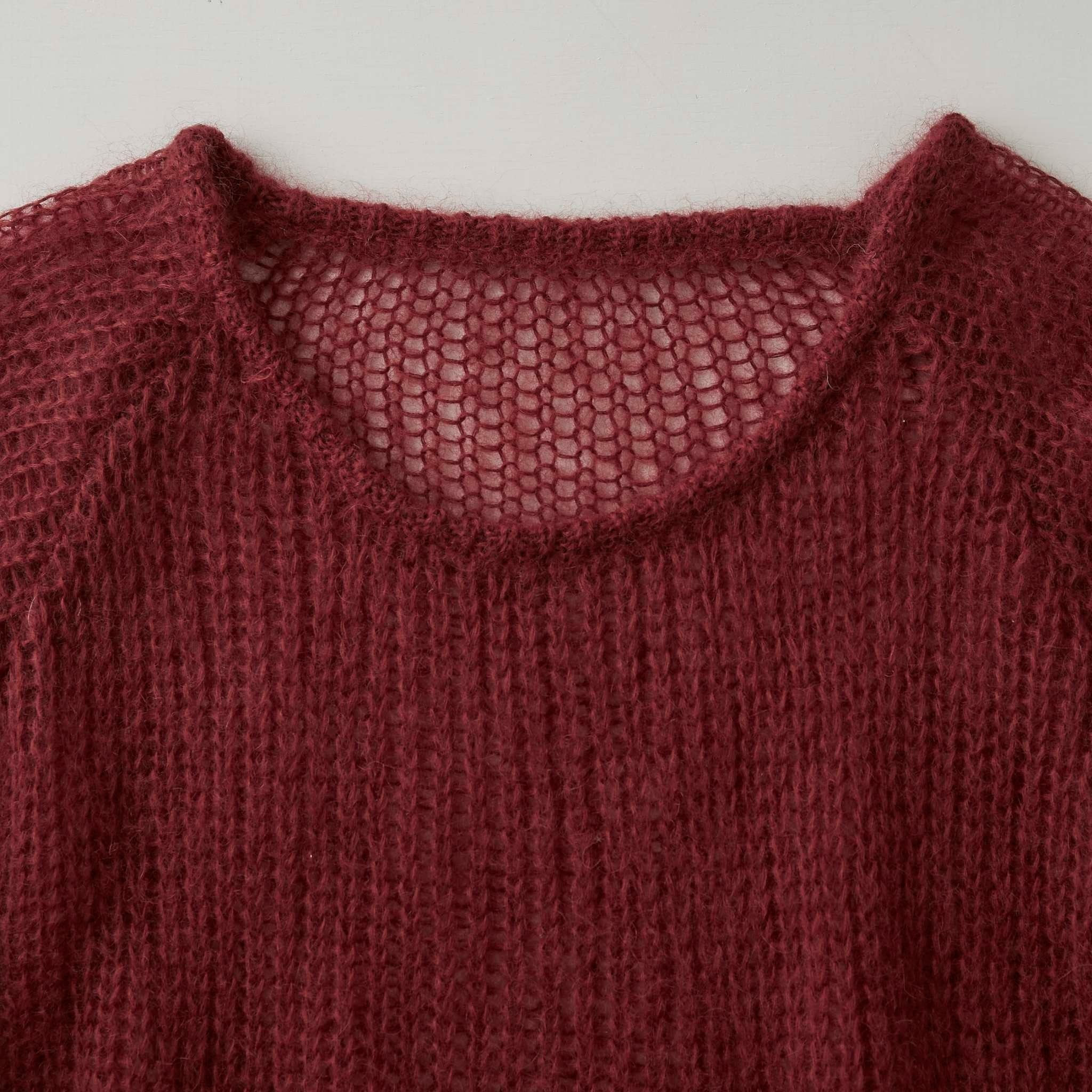 思わず抱きしめたくなるふわふわのモヘアニットは、今すぐ着たいItアイテム。今シーズンはシアーな編み地にすることで、大人のためのセンシュアルな一枚にアップデートしました。もちろん着心地にもこだわりが。柔らかなベビーモヘアを基調に、ウールとポリエステルを配合した糸を使い、モヘア特有のチクチク感を抑えました。また、保温性もあるのが特徴です。シルエットは、着たときにボディが泳ぐオーバーサイズに。ルーズに見えないよう、袖は折り返して二重にしています。COOPER CAMISOLEのようなサマーアイテムの上にオンすれば、シーズンの先取りに。寒くなったら、ORTOLAN SWEATERや、COTTON CASHMERE LONG SLEEVEのような薄手のニットにレイヤードして。カラーはバーガンディとライトグレーの2色です。可愛いだけじゃない、着こなしの幅を広げてくれる、使えるアイテムです。