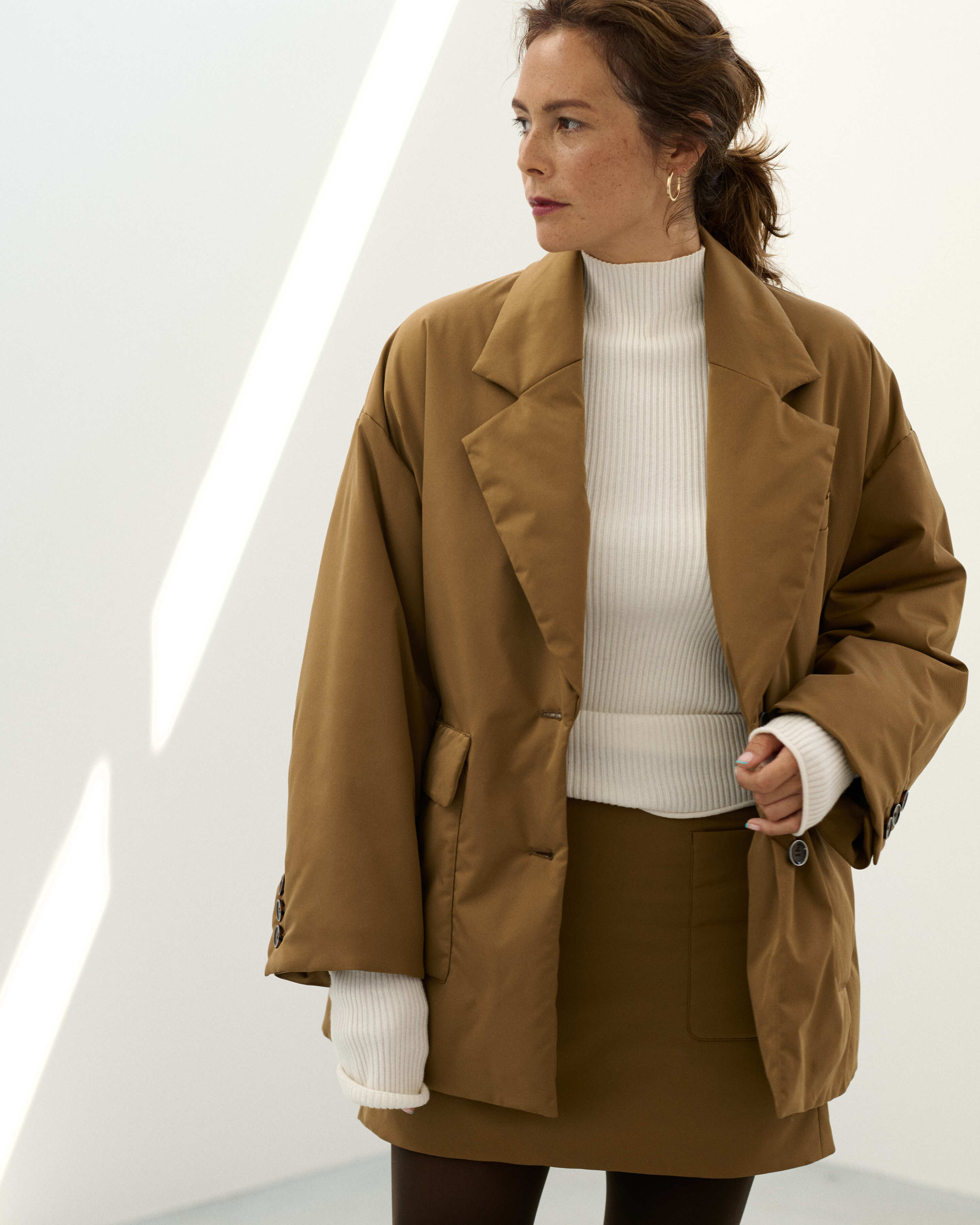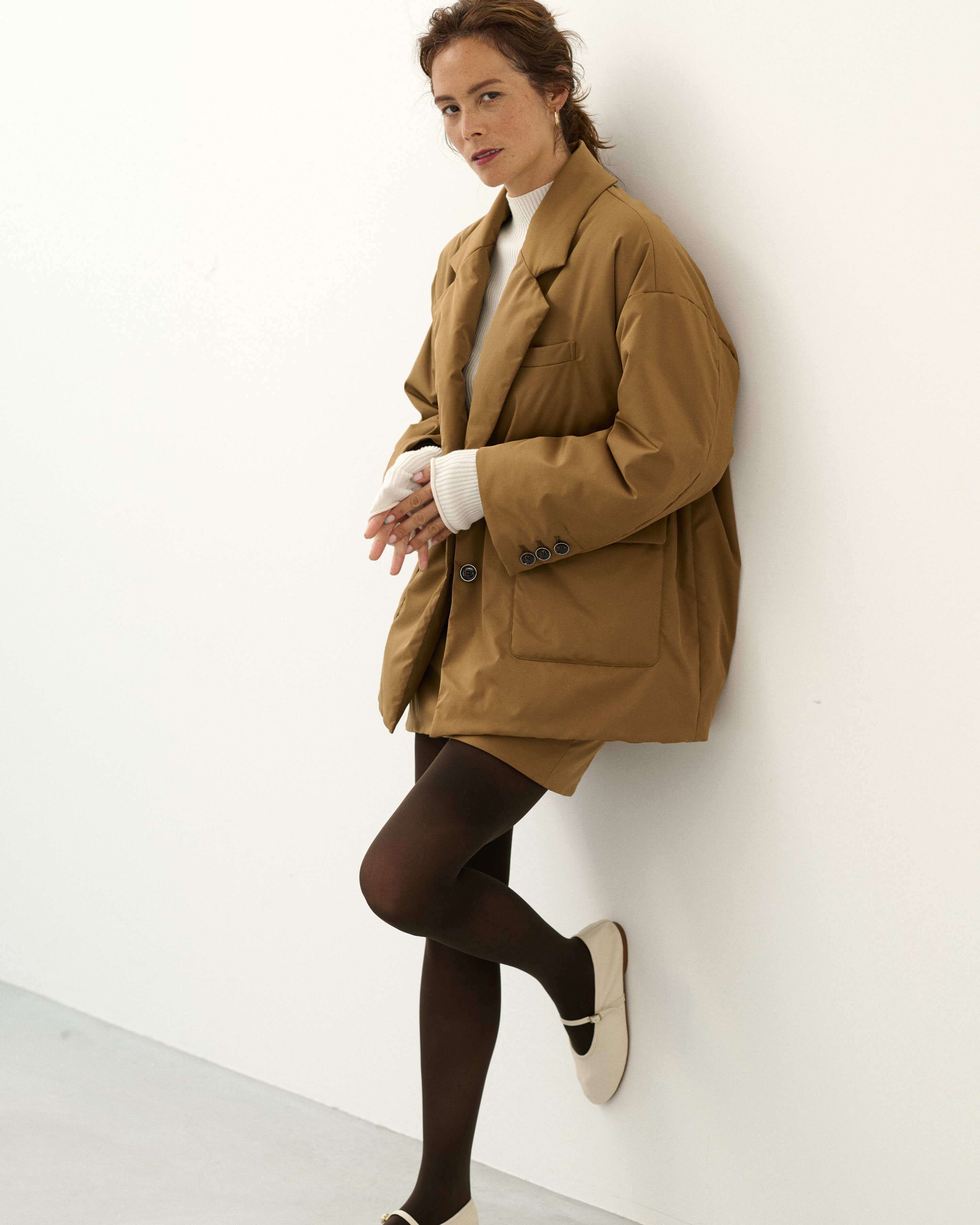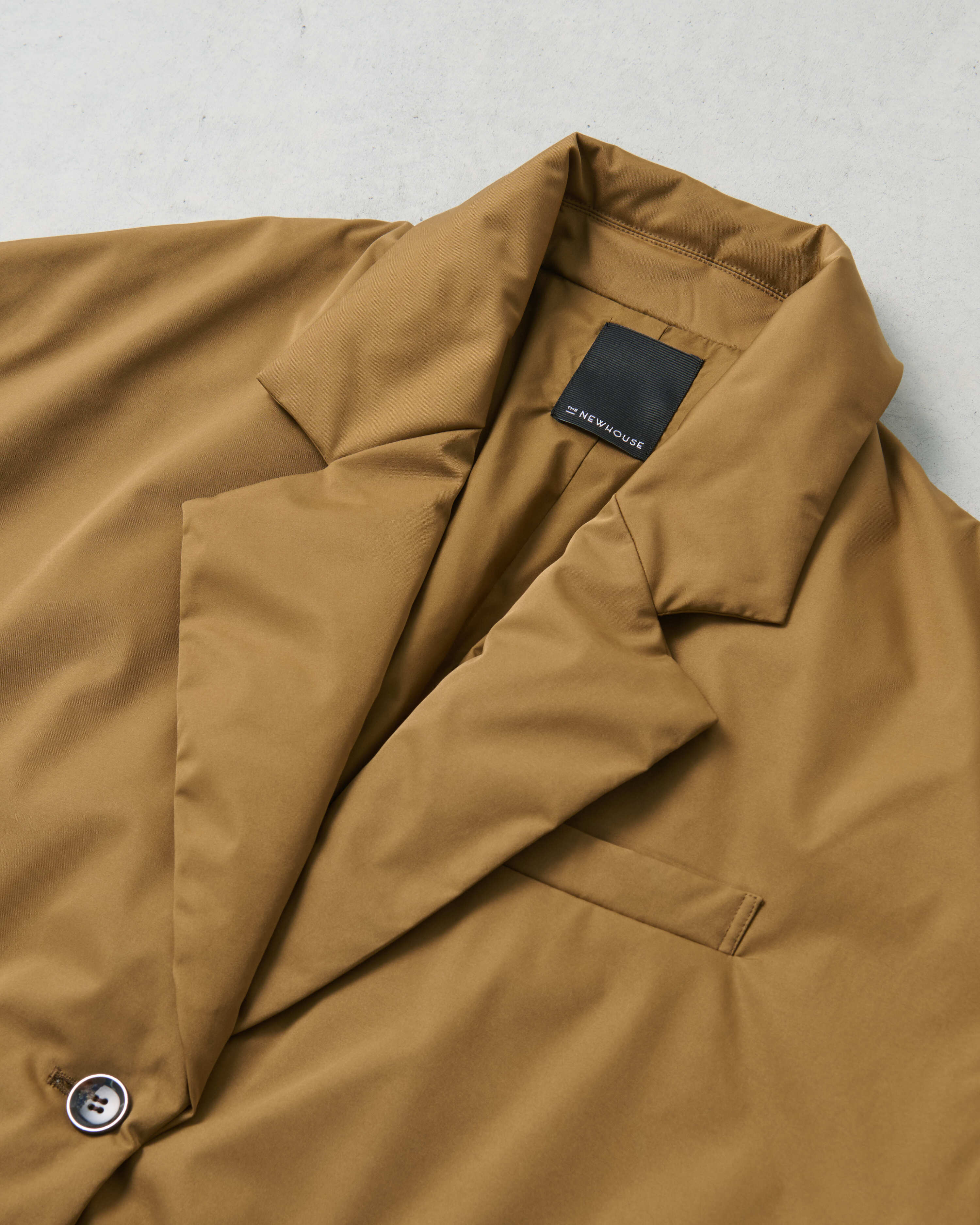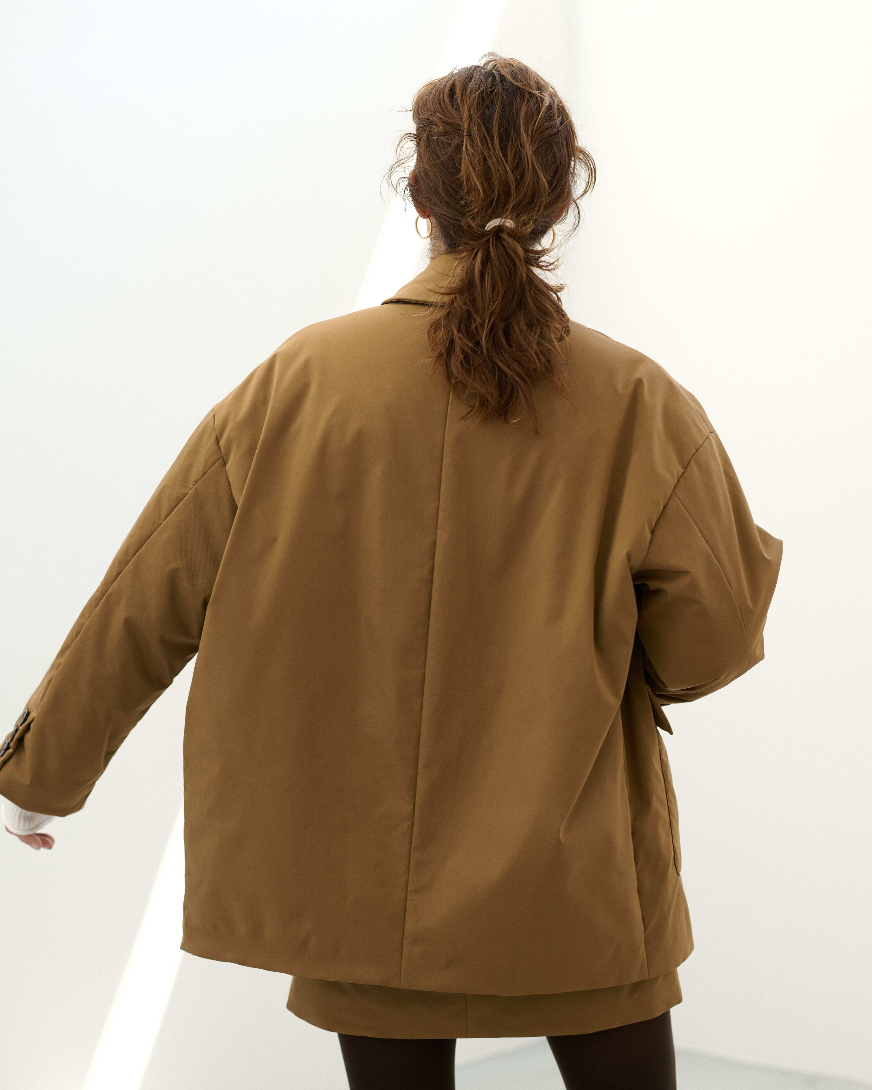 パデットブルゾンの手軽さはそのままに、ジャケットのきちんと感も併せ持つ中綿入りのアウター・CLAVER JACKET。昨年の発売時に即完売し、数回の再販を経ても、未だお問合せの絶えない大人気アイテムが新色を従え、待望のカムバックを果たします。イタリアのリモンタ社のユニークな生地は、マットなポリエステル地ながらナチュラルなストレッチ性もあり着やすさ抜群。撥水、防風、透湿という高機能性を備え、また、驚くほどの軽さも特筆すべきポイント。デイリーな使いやすさが魅力です。ハイテクな生地に対して、デザインは丸みと柔らかさのあるシルエット。ヒップが隠れるオーバーサイズなので、ショートコート感覚で着ていただけます。また、ボタンには縁にメタルのアクセントが。ぜひ同シリーズのCLAVER SKIRTとセットアップで楽しんで。