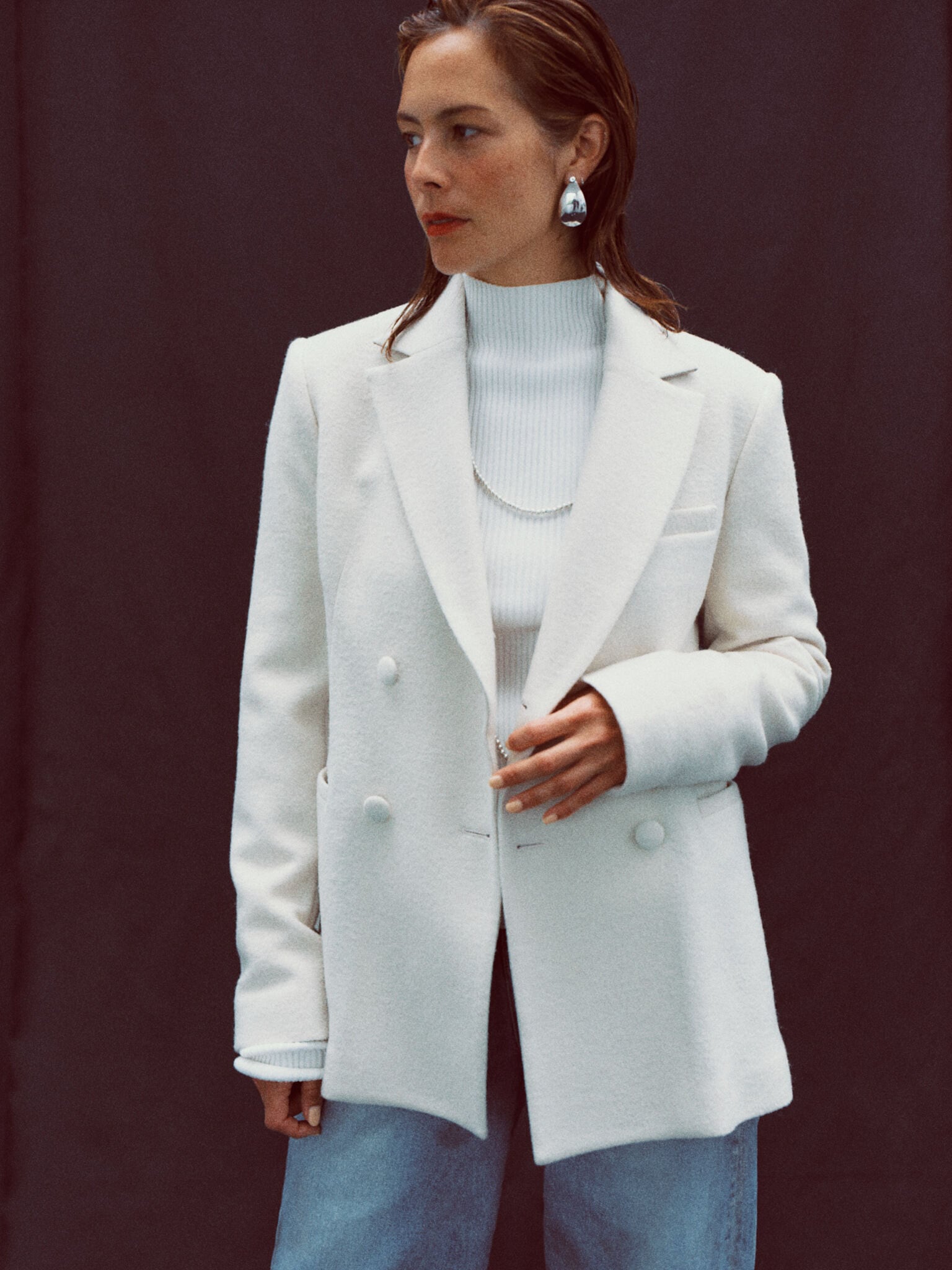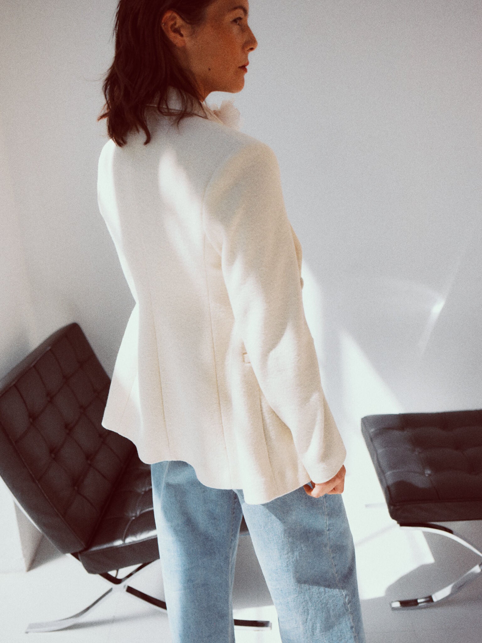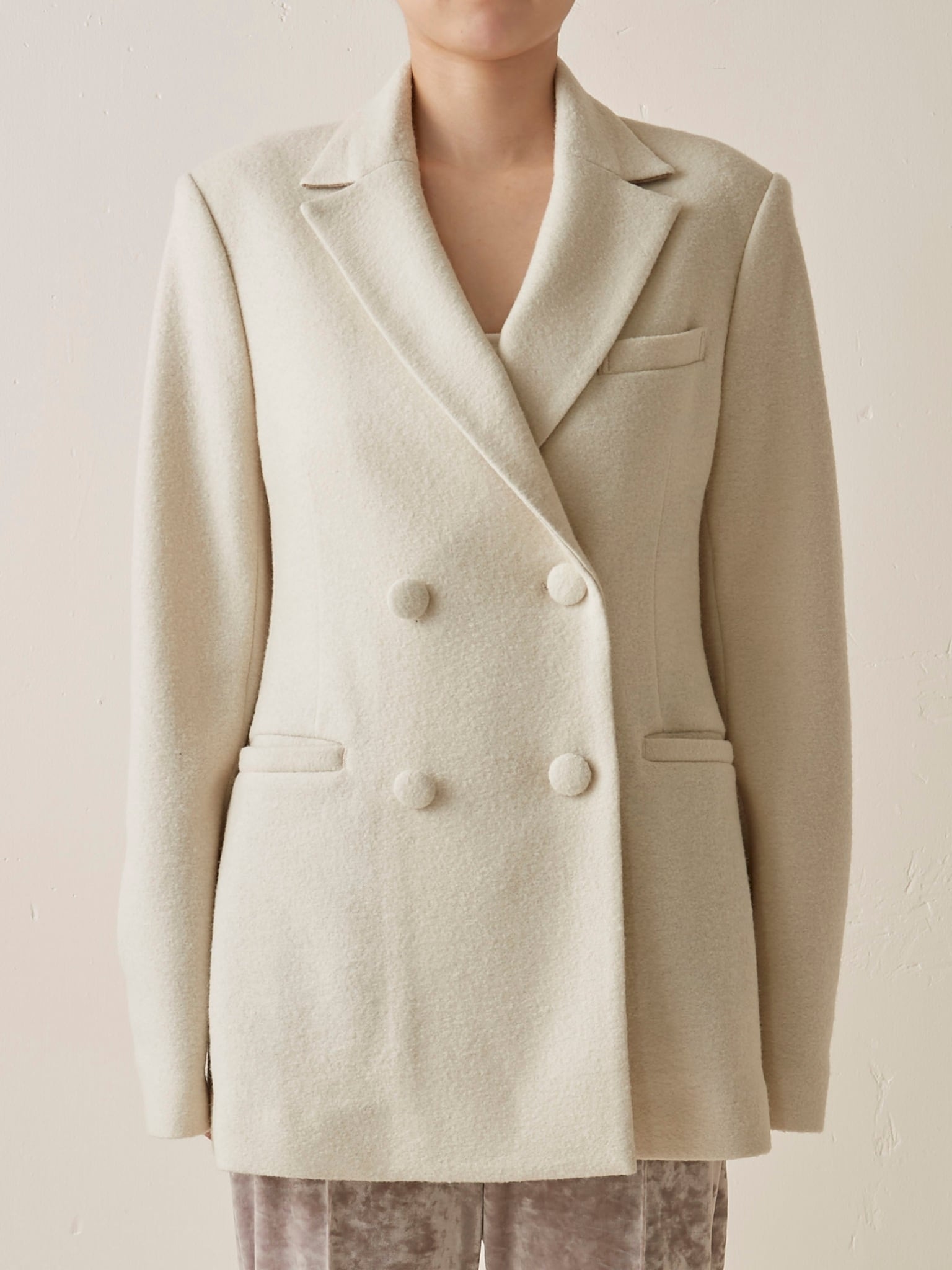 フェミニンなシルエットが魅力のジャケット・VARENNA JACKET。クラシカルなムードの中に、凛とした印象を感じさせます。きちんと感がありながら、生地は圧縮したブークレー糸を使ったジャージー。もこもこした風合いが可愛らしく、とても軽いのが特徴です。シルエットはウエストのシェイプラインを高く設定し、ボディラインを美しく見せるカーヴィーな形に。共布のくるみボタンを留めると、ウエストから裾にかけてドレスのようなドレープがとても綺麗。バックスタイルも様になります。カラーは鮮やかなヴァイオレットと、柔らかなアイボリーの2色をご用意。気軽に心地よく羽織れ、スタイルを一枚で決めてくれるアイテムです。
