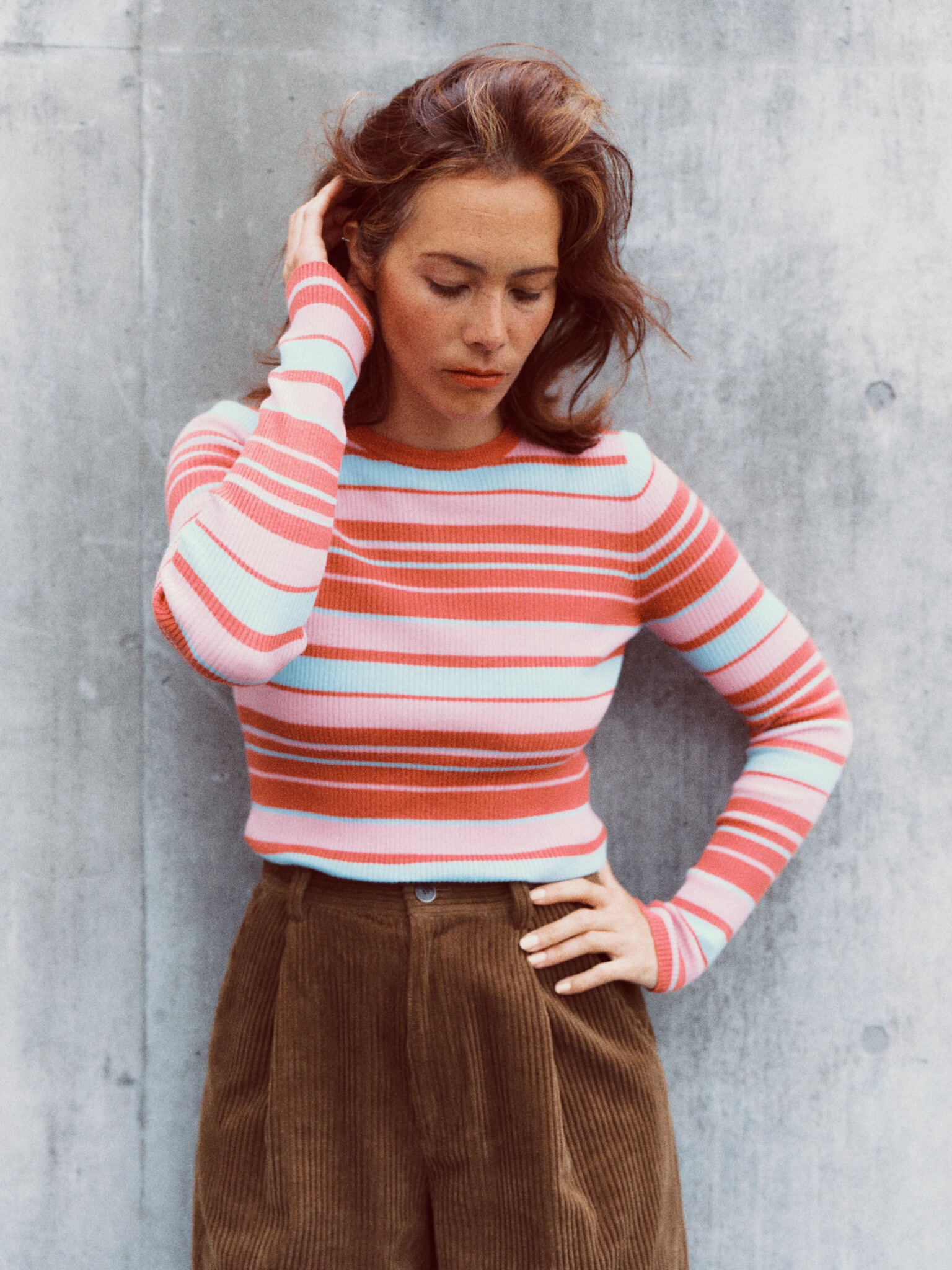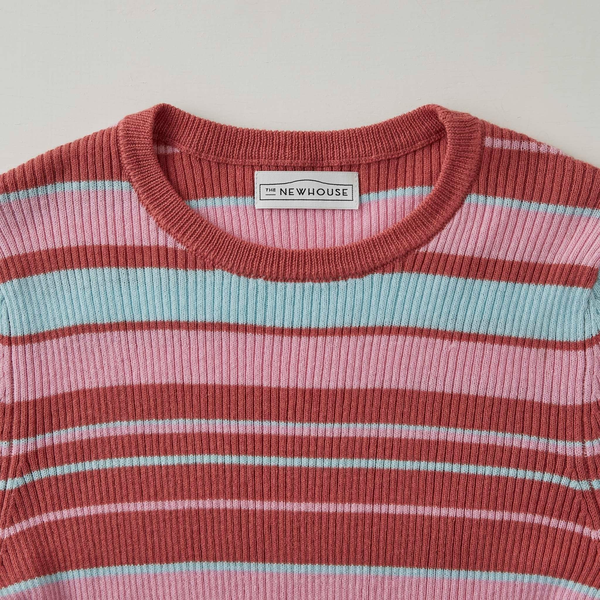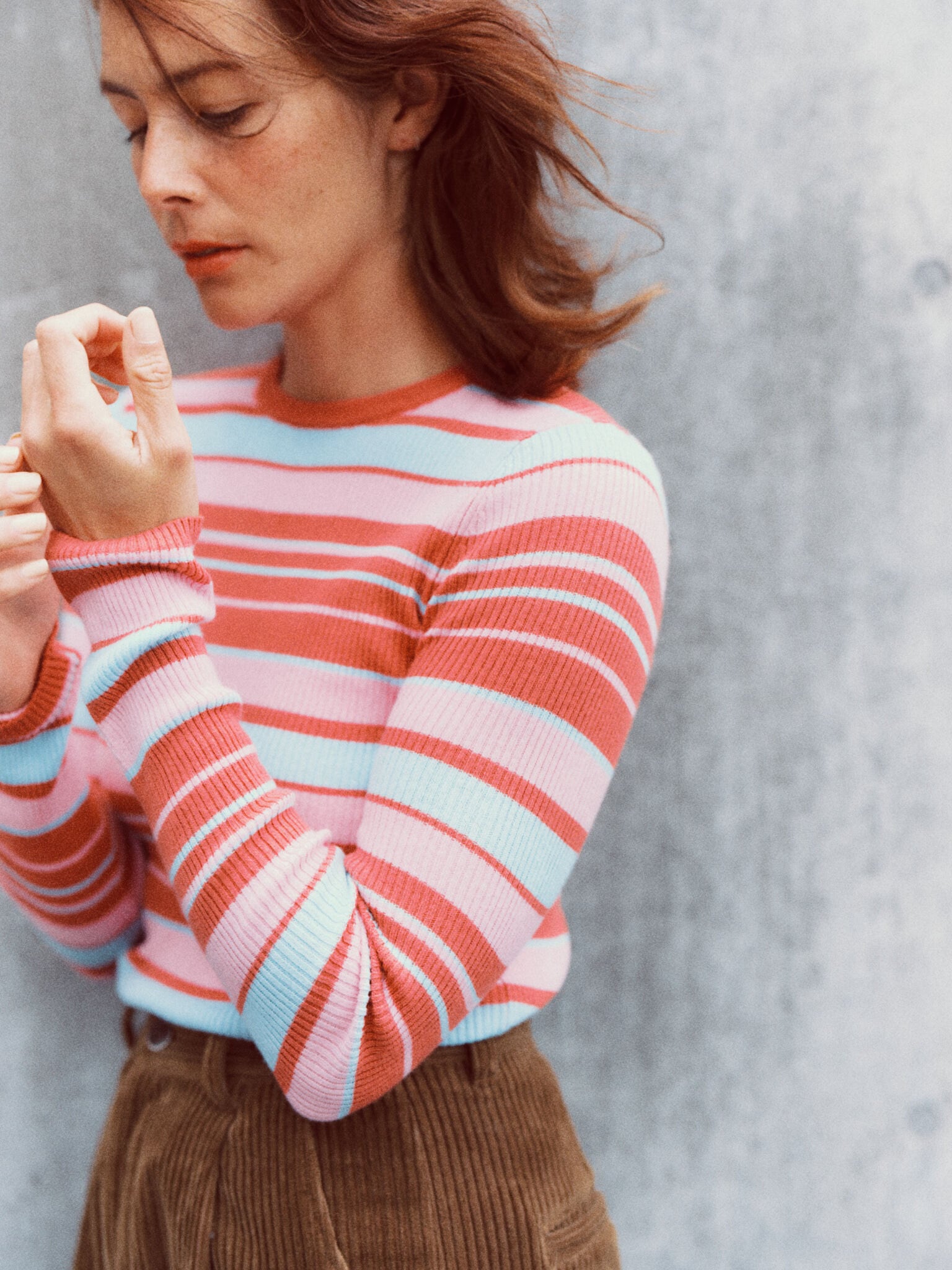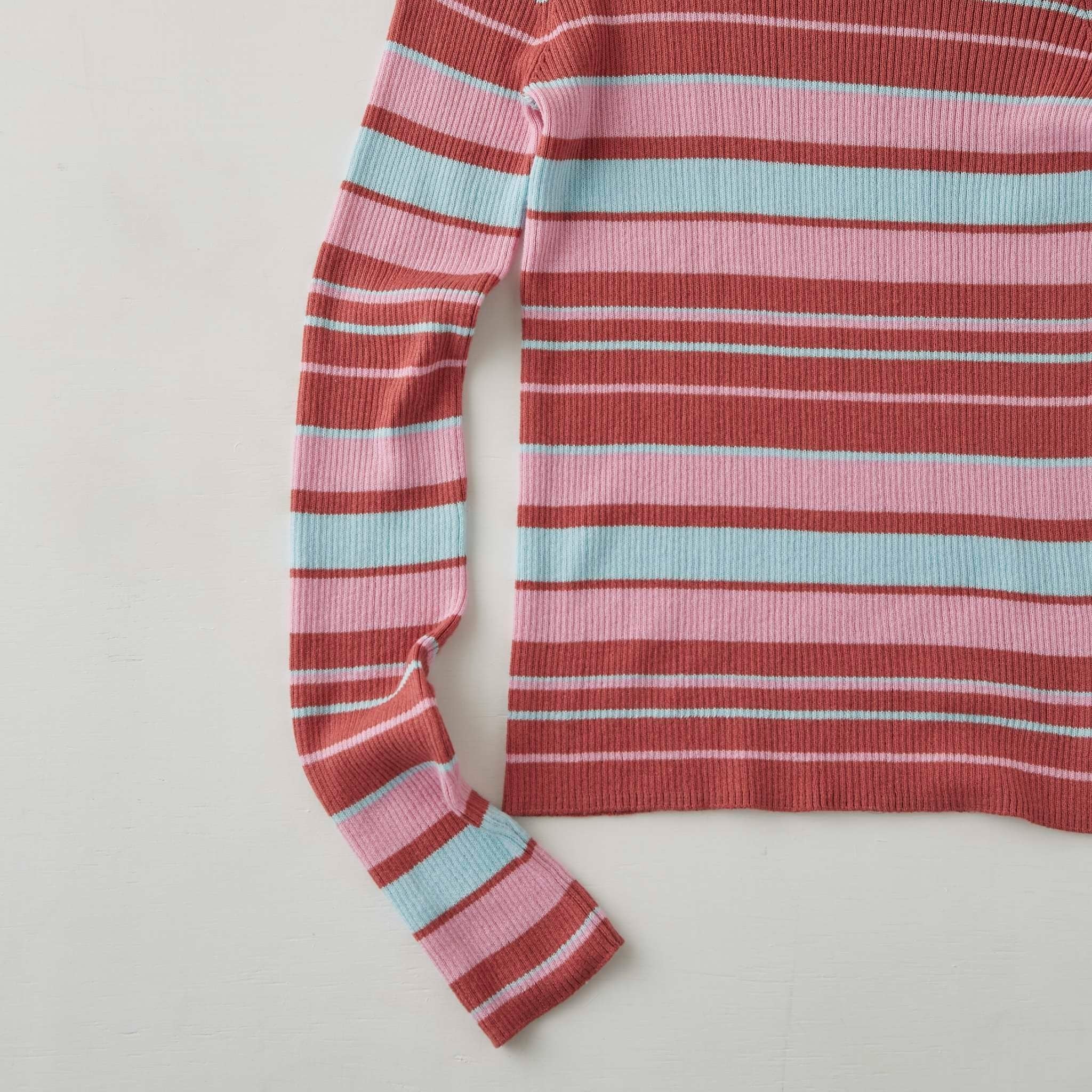 ダークトーンに染まる秋冬のワードローブには、マルチボーダーでノスタルジックな華やかさを加えて。柔らかくチクチクしないリブのニット生地は、コットンに少しのカシミヤをブレンドした糸で編み上げています。薄手なので、肌着のような感覚で着ていただけます。シルエットは程よい細身。ショルダーや腕周りにフィット感があるので、ほっそり華奢に見せてくれる効果が。今シーズンのトレンドでもあるレイヤードスタイルのベースにもぴったりです。OLIVE LONG SLEEVEのような透け感のあるモヘアニットのインに着るのもユニーク。また、ボトムはTNH MILTON JEAN のようなボリュームのあるものと相性抜群。シンプルにデニムと合わせても、マルチボーダーがコーディネートの主役になって垢抜けた印象に。カラーはブルー系を基調としたグレーマルチと、大人ガーリーな配色のピンクマルチの2色をご用意しました。コーディネートに大人の遊び心をプラスしてくれる、カラフルなリブニットです。