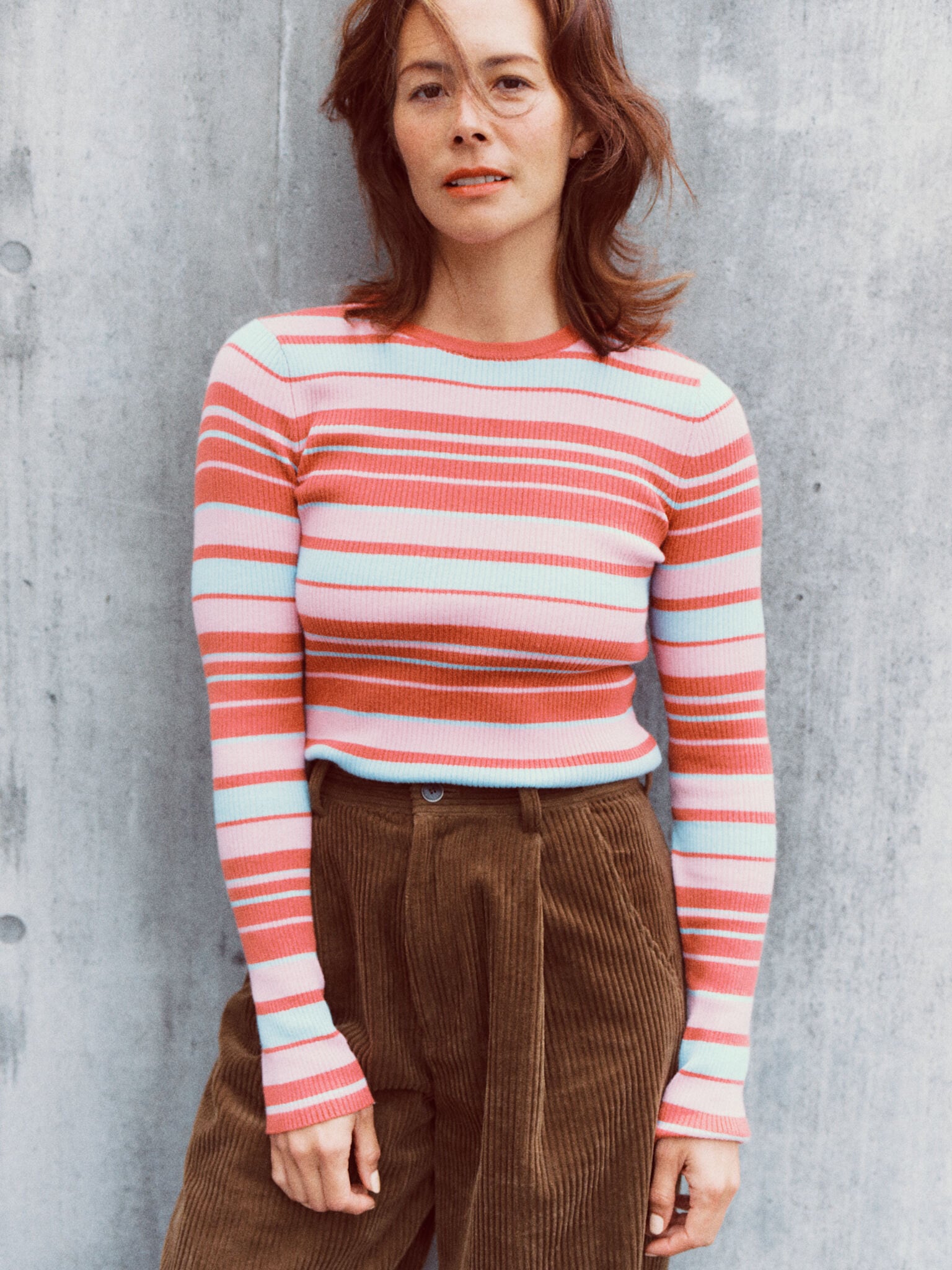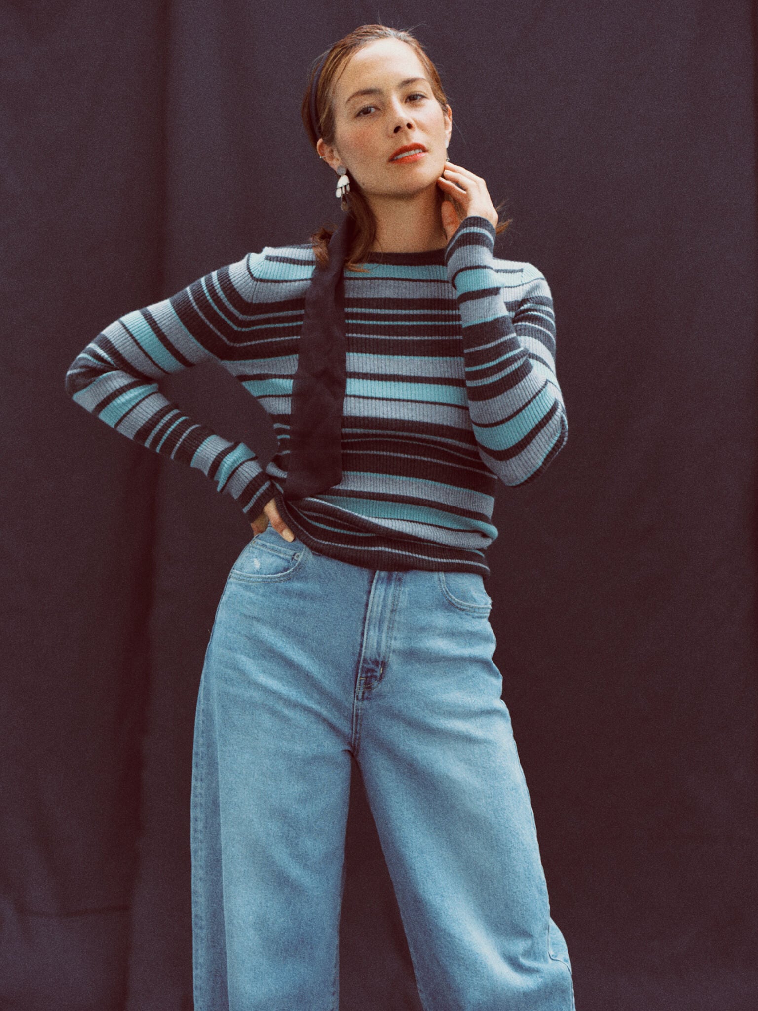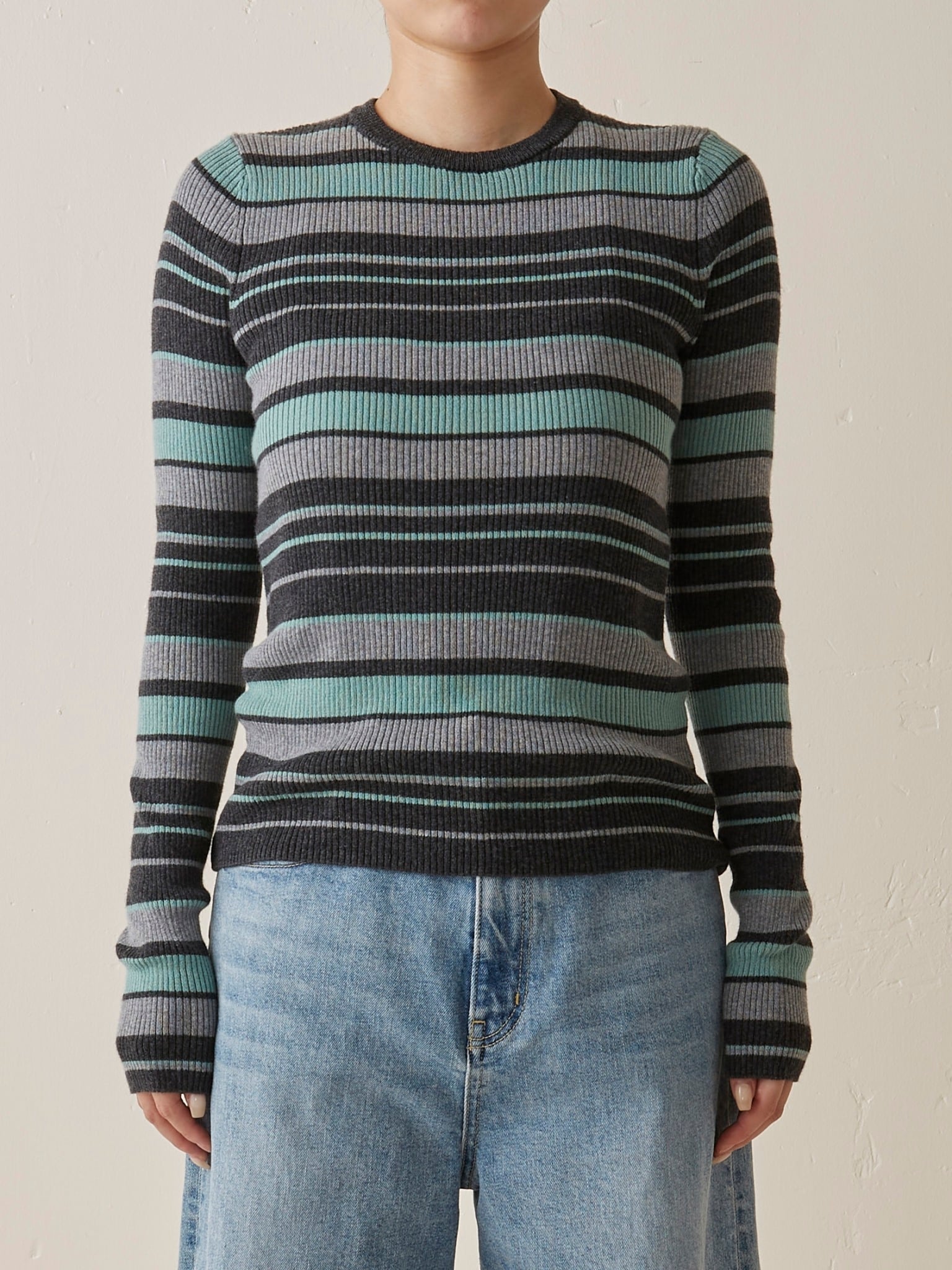 ダークトーンに染まる秋冬のワードローブには、マルチボーダーでノスタルジックな華やかさを加えて。柔らかくチクチクしないリブのニット生地は、コットンに少しのカシミヤをブレンドした糸で編み上げています。薄手なので、肌着のような感覚で着ていただけます。シルエットは程よい細身。ショルダーや腕周りにフィット感があるので、ほっそり華奢に見せてくれる効果が。今シーズンのトレンドでもあるレイヤードスタイルのベースにもぴったりです。OLIVE LONG SLEEVEのような透け感のあるモヘアニットのインに着るのもユニーク。また、ボトムはTNH MILTON JEAN のようなボリュームのあるものと相性抜群。シンプルにデニムと合わせても、マルチボーダーがコーディネートの主役になって垢抜けた印象に。カラーはブルー系を基調としたグレーマルチと、大人ガーリーな配色のピンクマルチの2色をご用意しました。コーディネートに大人の遊び心をプラスしてくれる、カラフルなリブニットです。