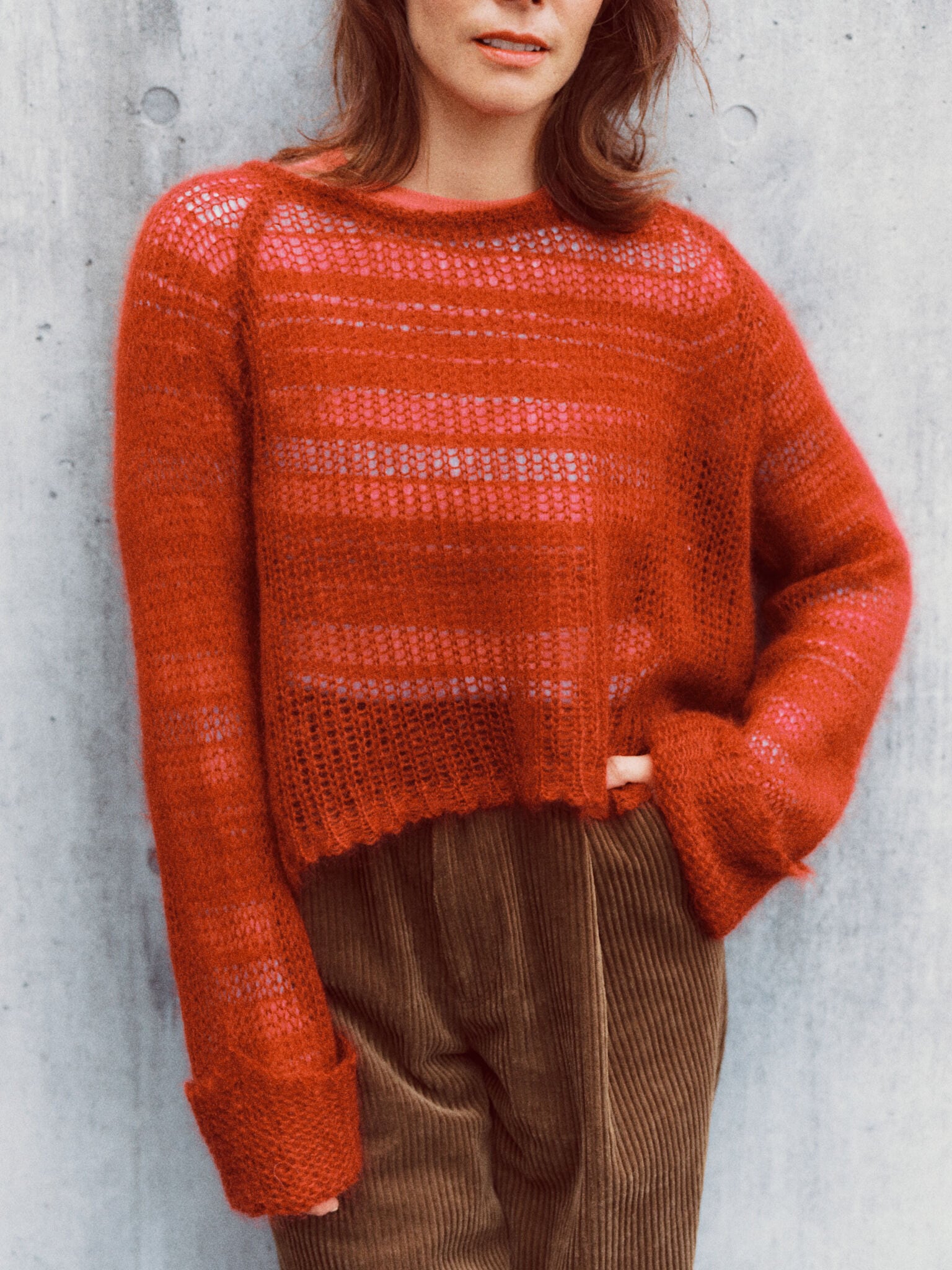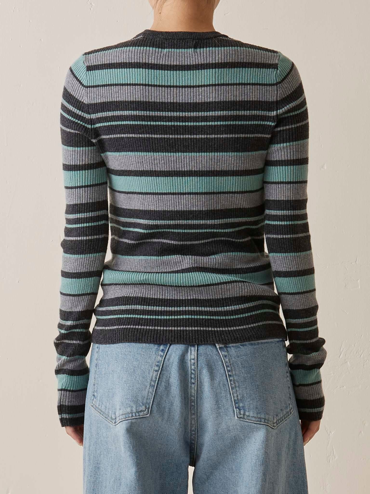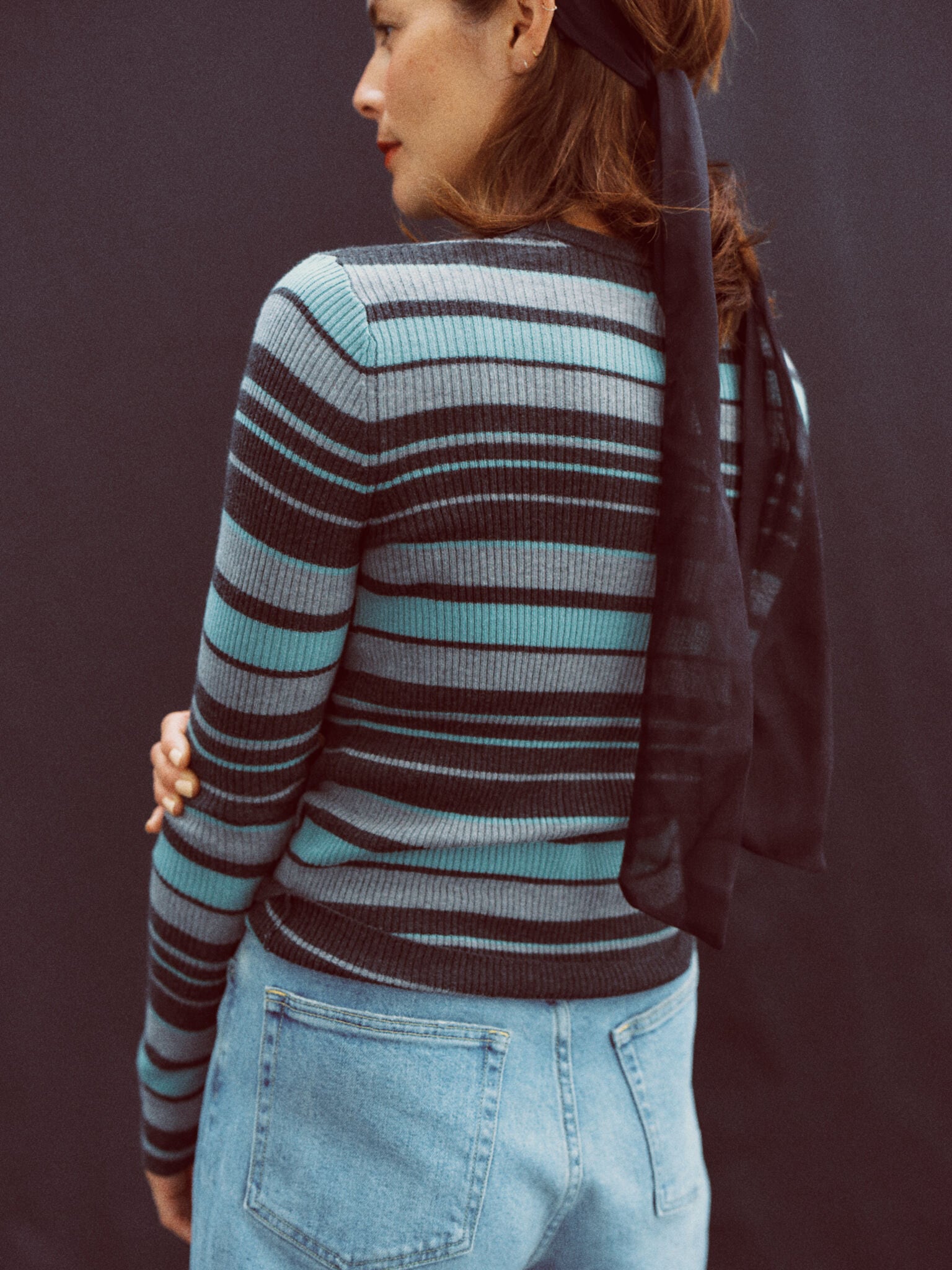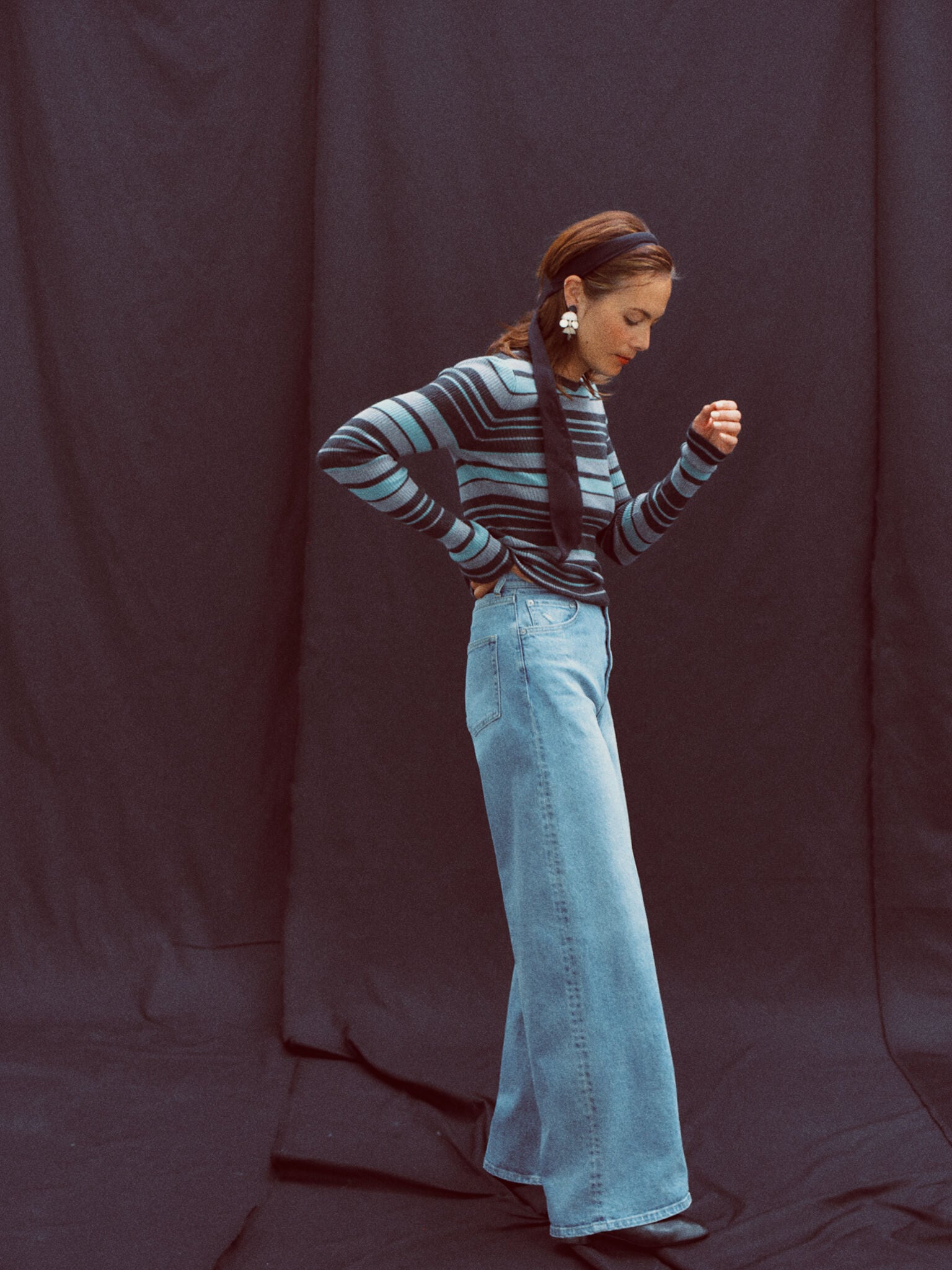 ダークトーンに染まる秋冬のワードローブには、マルチボーダーでノスタルジックな華やかさを加えて。柔らかくチクチクしないリブのニット生地は、コットンに少しのカシミヤをブレンドした糸で編み上げています。薄手なので、肌着のような感覚で着ていただけます。シルエットは程よい細身。ショルダーや腕周りにフィット感があるので、ほっそり華奢に見せてくれる効果が。今シーズンのトレンドでもあるレイヤードスタイルのベースにもぴったりです。OLIVE LONG SLEEVEのような透け感のあるモヘアニットのインに着るのもユニーク。また、ボトムはTNH MILTON JEAN のようなボリュームのあるものと相性抜群。シンプルにデニムと合わせても、マルチボーダーがコーディネートの主役になって垢抜けた印象に。カラーはブルー系を基調としたグレーマルチと、大人ガーリーな配色のピンクマルチの2色をご用意しました。コーディネートに大人の遊び心をプラスしてくれる、カラフルなリブニットです。