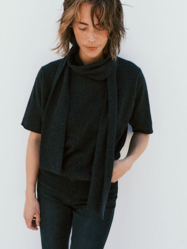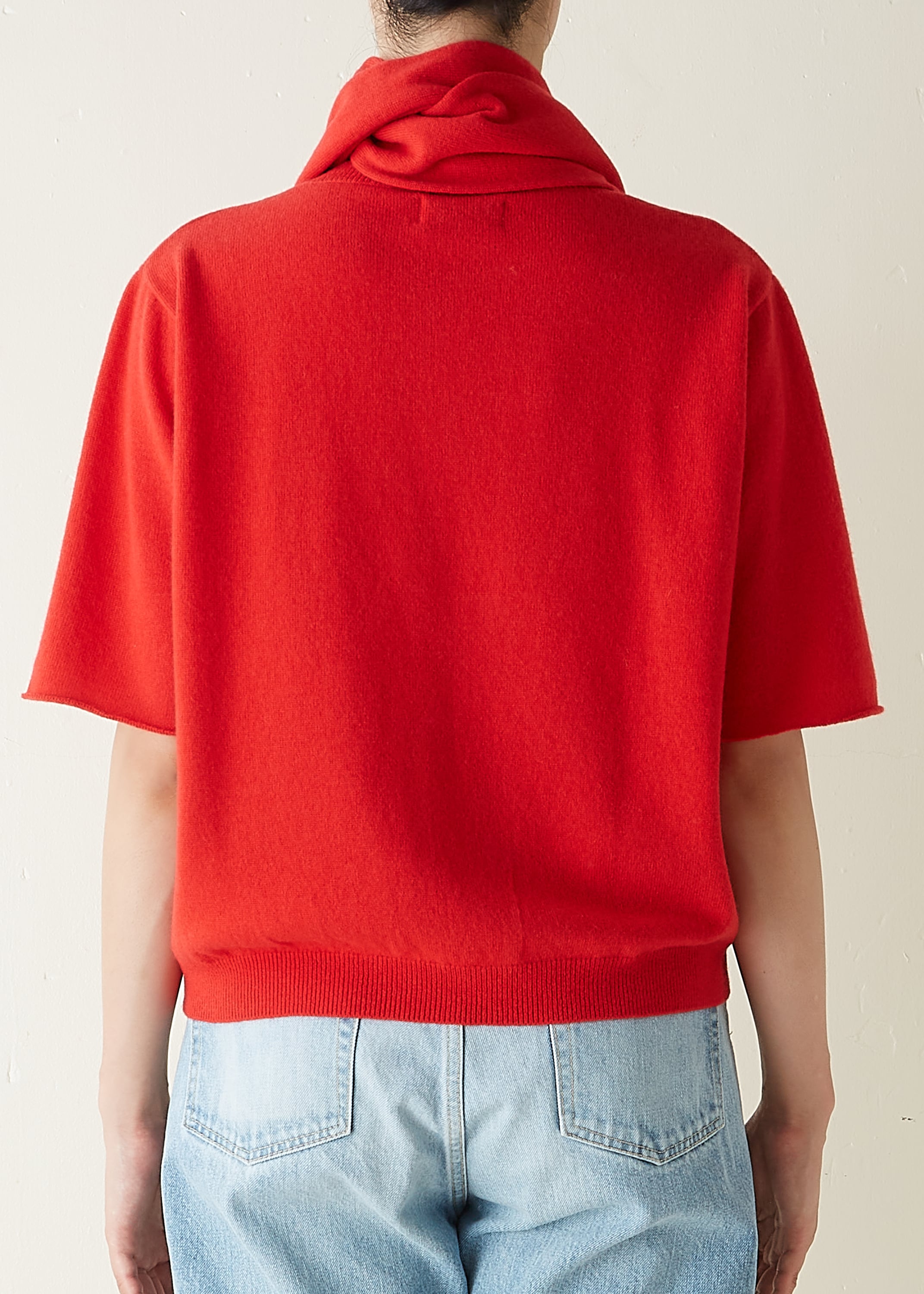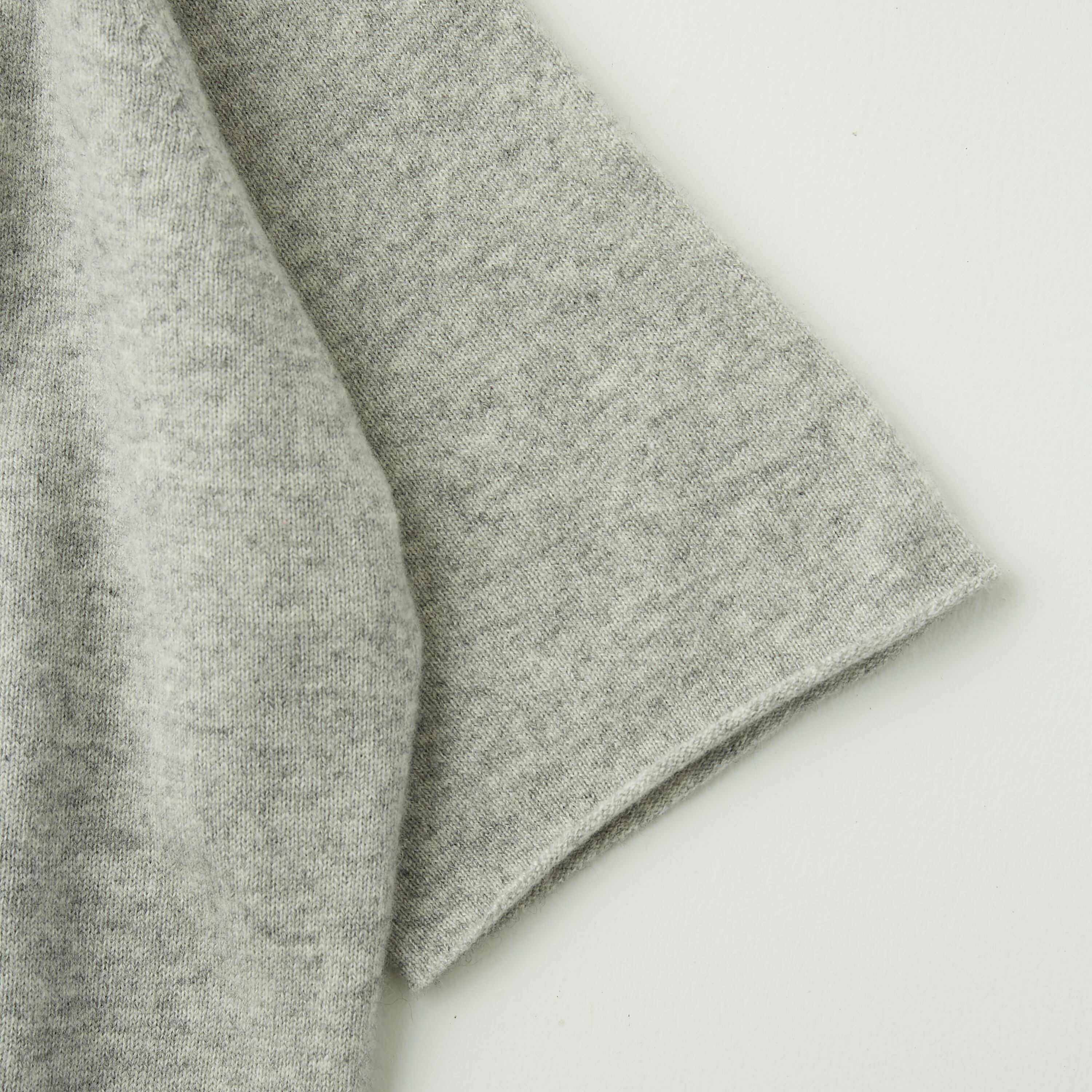 まだ暑い時期から活躍してくれる、半袖ニットとストールのセットが登場です。カシミアを30%ブレンドした糸を使い、チクチクせずに軽やかな着心地。体にフィットしながらも、体のラインを拾いにくい程よいサイズ感です。袖を切りっぱなしにすることでブランドらしいカジュアルさもプラス。裾のリブを細めにし、5部袖にしたことで、Tシャツ感覚で着こなしていただけます。付属のストールは、巻き方で遊べるよう長めのサイズ。オリジナルの着こなしをぜひ楽しんでください。カラーは今シーズンのブランドのポイントカラーであるレッド、上品なトップグレー、肌映りのいいピンク、メランジ感がかわいいチャコールグレーの4色。秋の着こなしに華やかさを加えてくれるカラーパレットで揃えました。