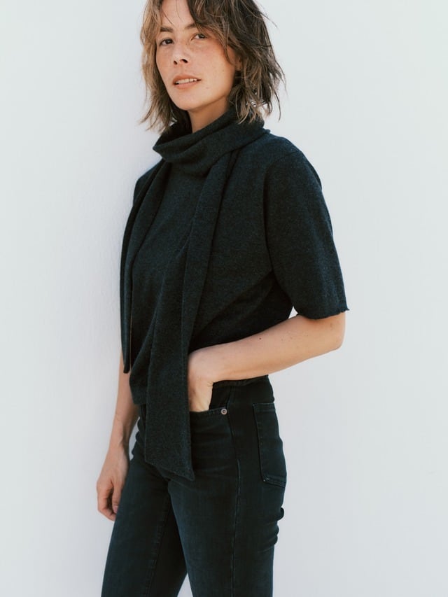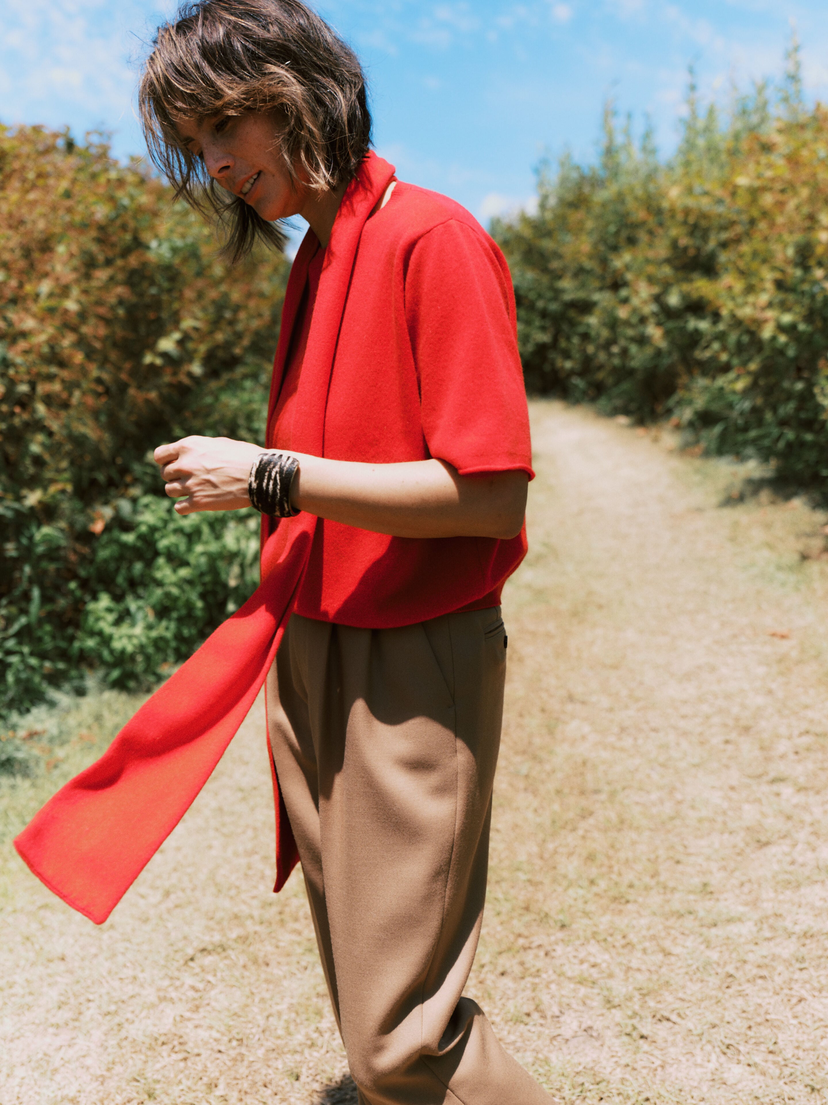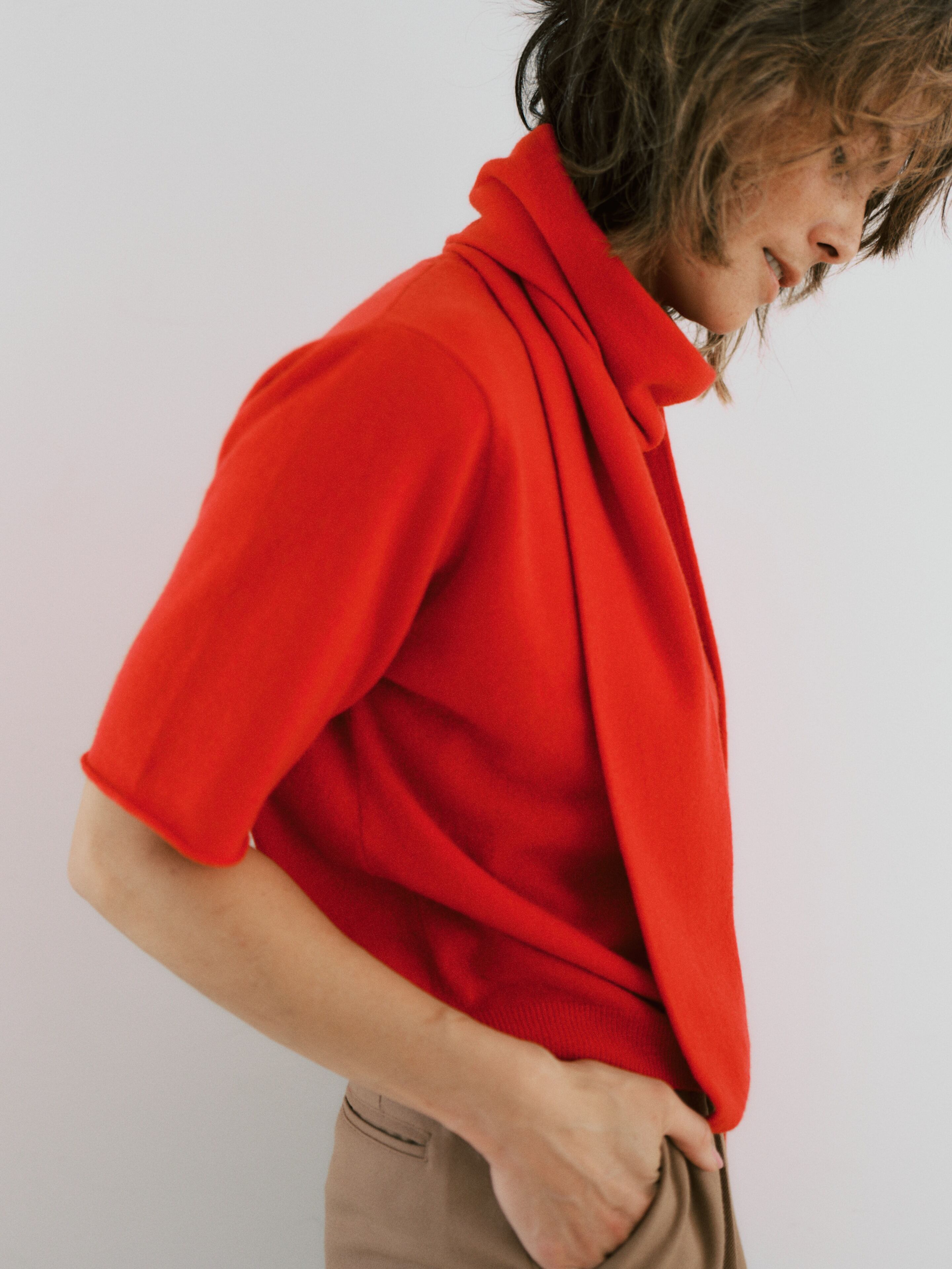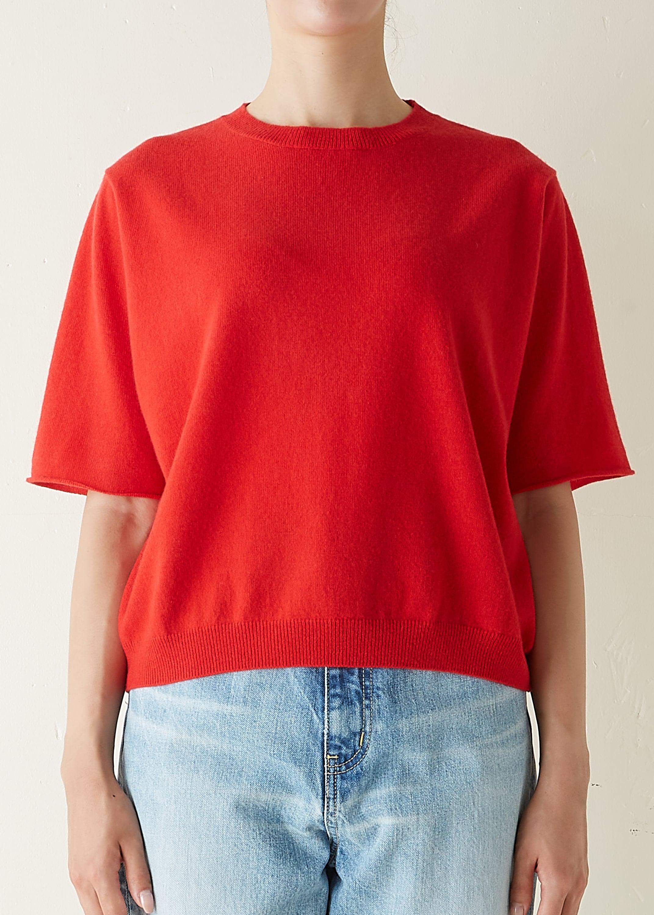 まだ暑い時期から活躍してくれる、半袖ニットとストールのセットが登場です。カシミアを30%ブレンドした糸を使い、チクチクせずに軽やかな着心地。体にフィットしながらも、体のラインを拾いにくい程よいサイズ感です。袖を切りっぱなしにすることでブランドらしいカジュアルさもプラス。裾のリブを細めにし、5部袖にしたことで、Tシャツ感覚で着こなしていただけます。付属のストールは、巻き方で遊べるよう長めのサイズ。オリジナルの着こなしをぜひ楽しんでください。カラーは今シーズンのブランドのポイントカラーであるレッド、上品なトップグレー、肌映りのいいピンク、メランジ感がかわいいチャコールグレーの4色。秋の着こなしに華やかさを加えてくれるカラーパレットで揃えました。