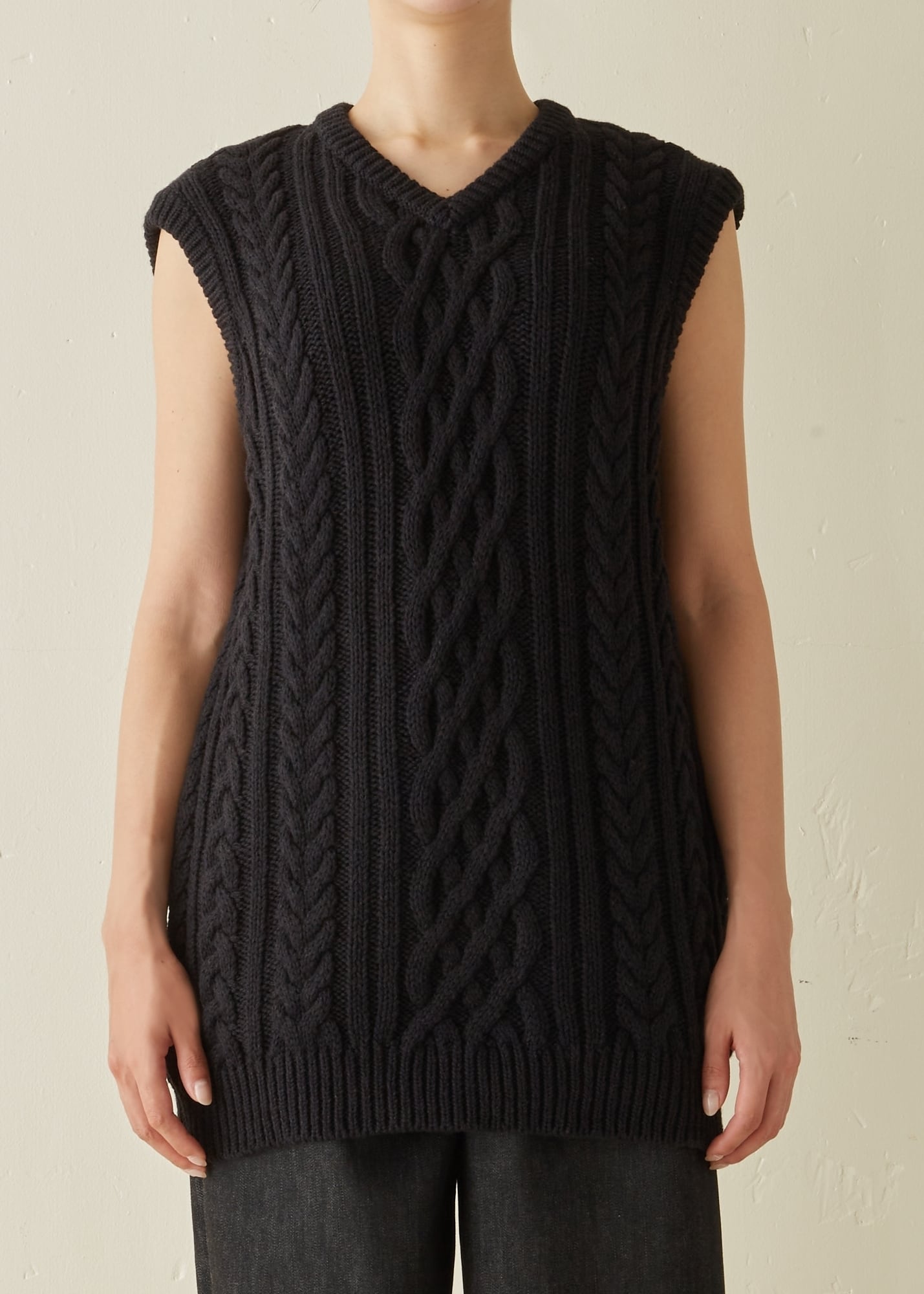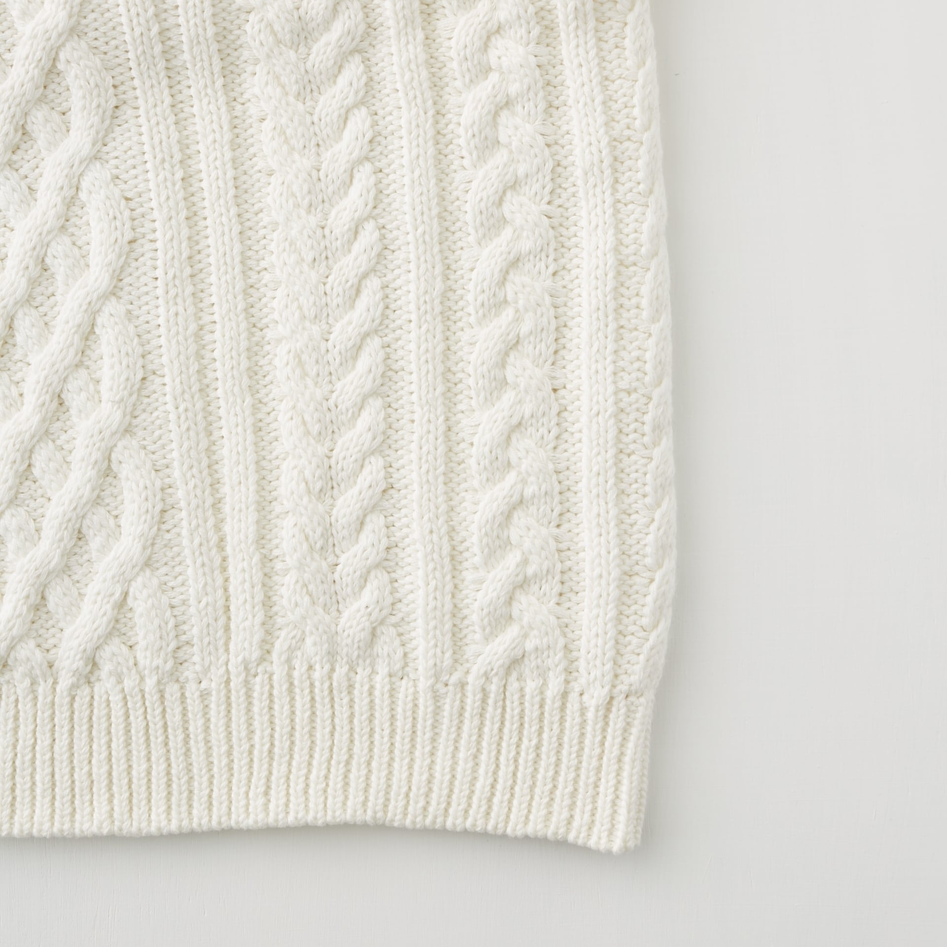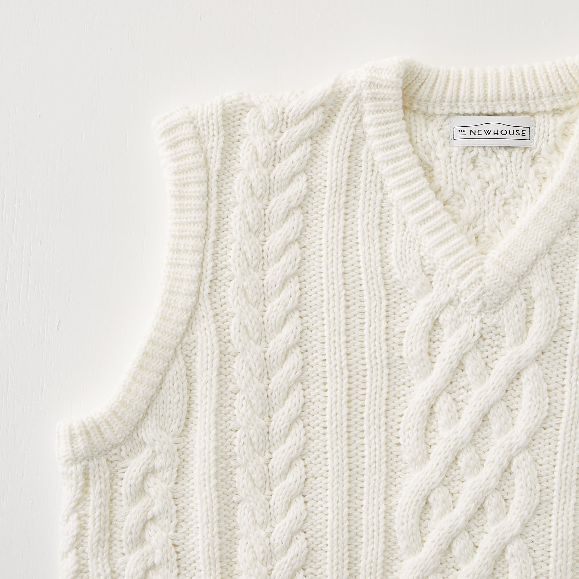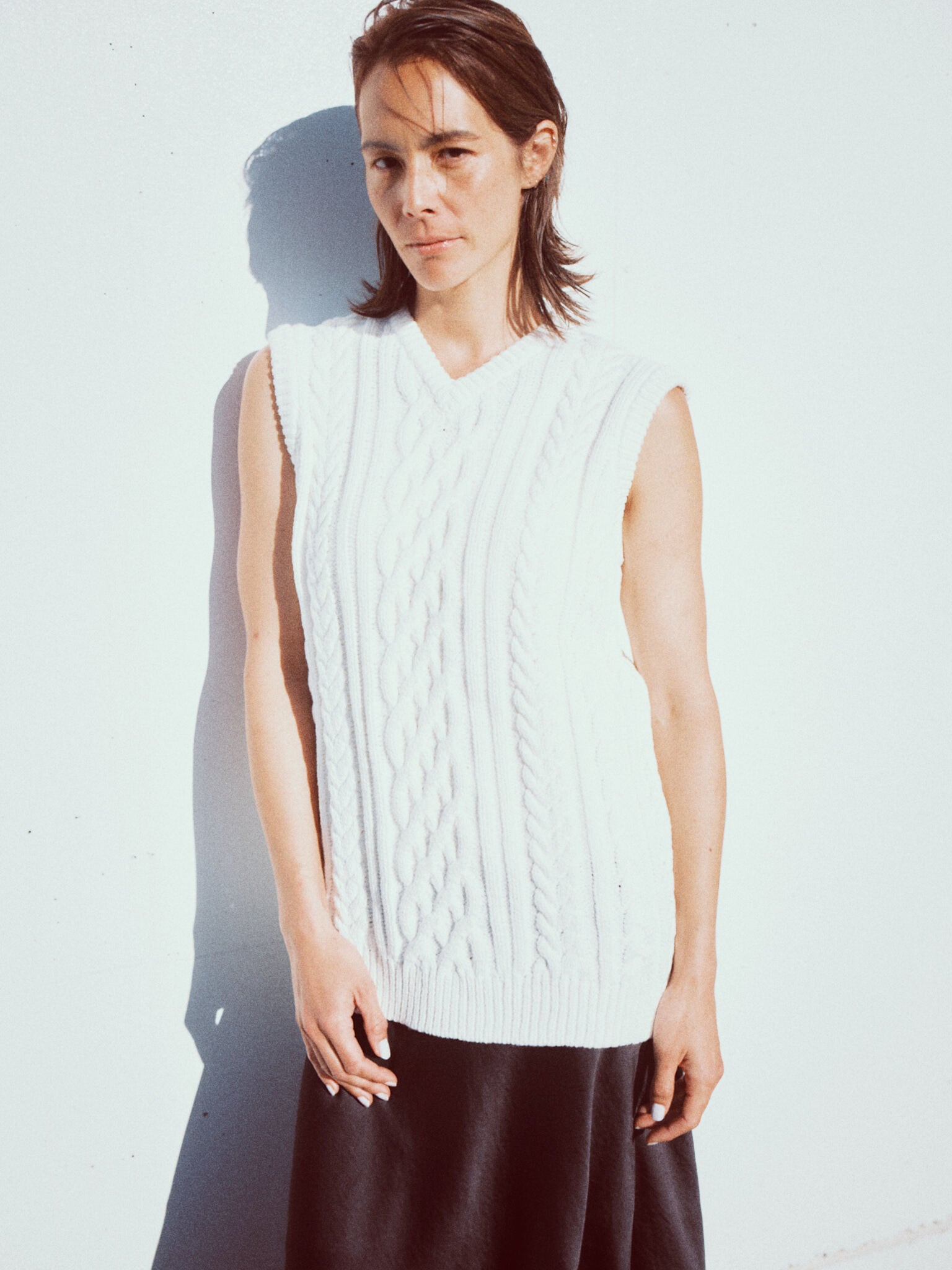 オーセンティックなケーブルニットは、クローゼットに一枚持っておきたいアイテム。シーズンレスに使っていただけるよう、コットン90%にカシミアとナイロンを5%ずつブレンドした糸で編み上げました。編み地にもこだわり、華のあるノスタルジックなケーブル編みに仕上げました。一枚でも着やすい浅めのVネックベストは、ヒップまで隠れる長めの丈。程よく体が泳ぐサイズ感で、コーディネートしやすいバランスとなっています。TNH HENRY JEANのようなワイドシルエットのボトムスに合わせたり、サテンのスカートに合わせるのも素敵。カラーはクリーンなホワイトとシャープなブラックの2色をご用意しました。トレンドに左右されることなく、シーズンレスに、そしてタイムレスに着こなしていただけるニットです。