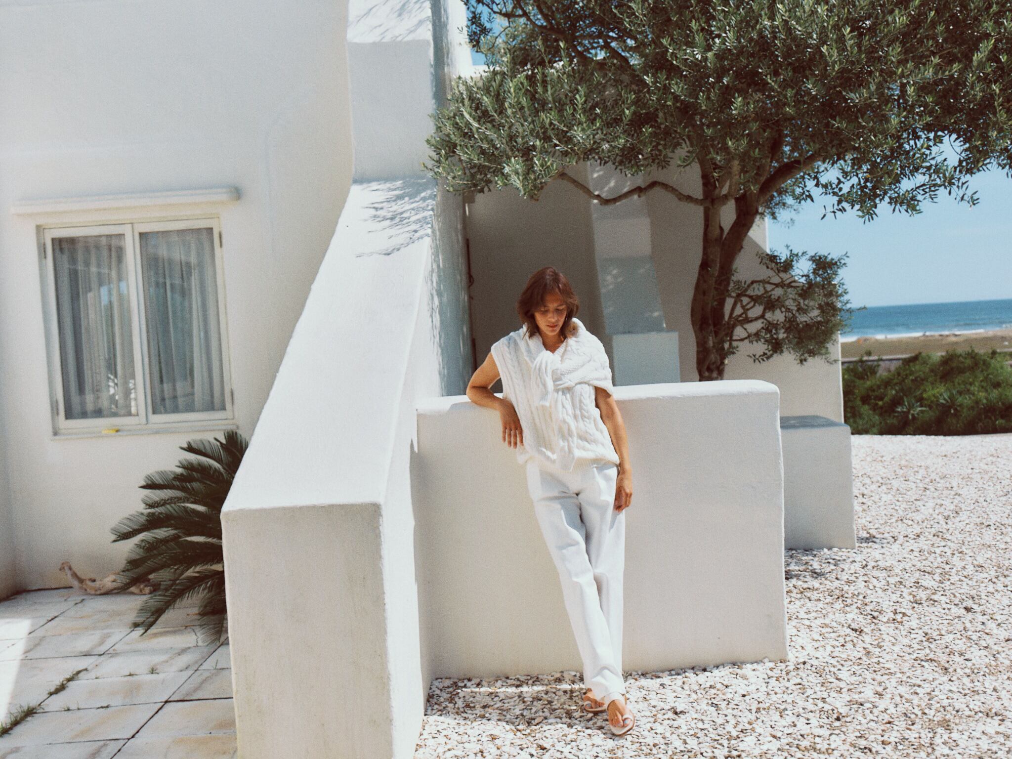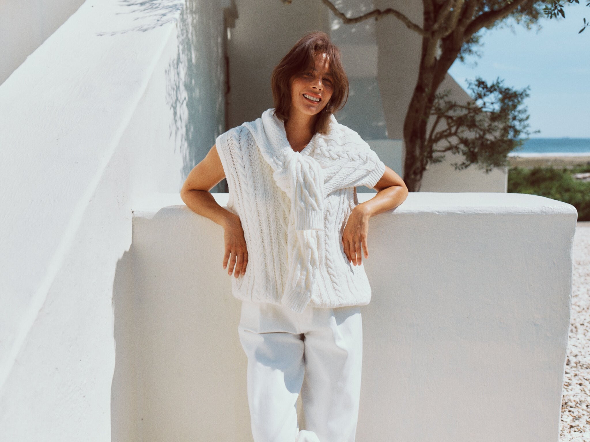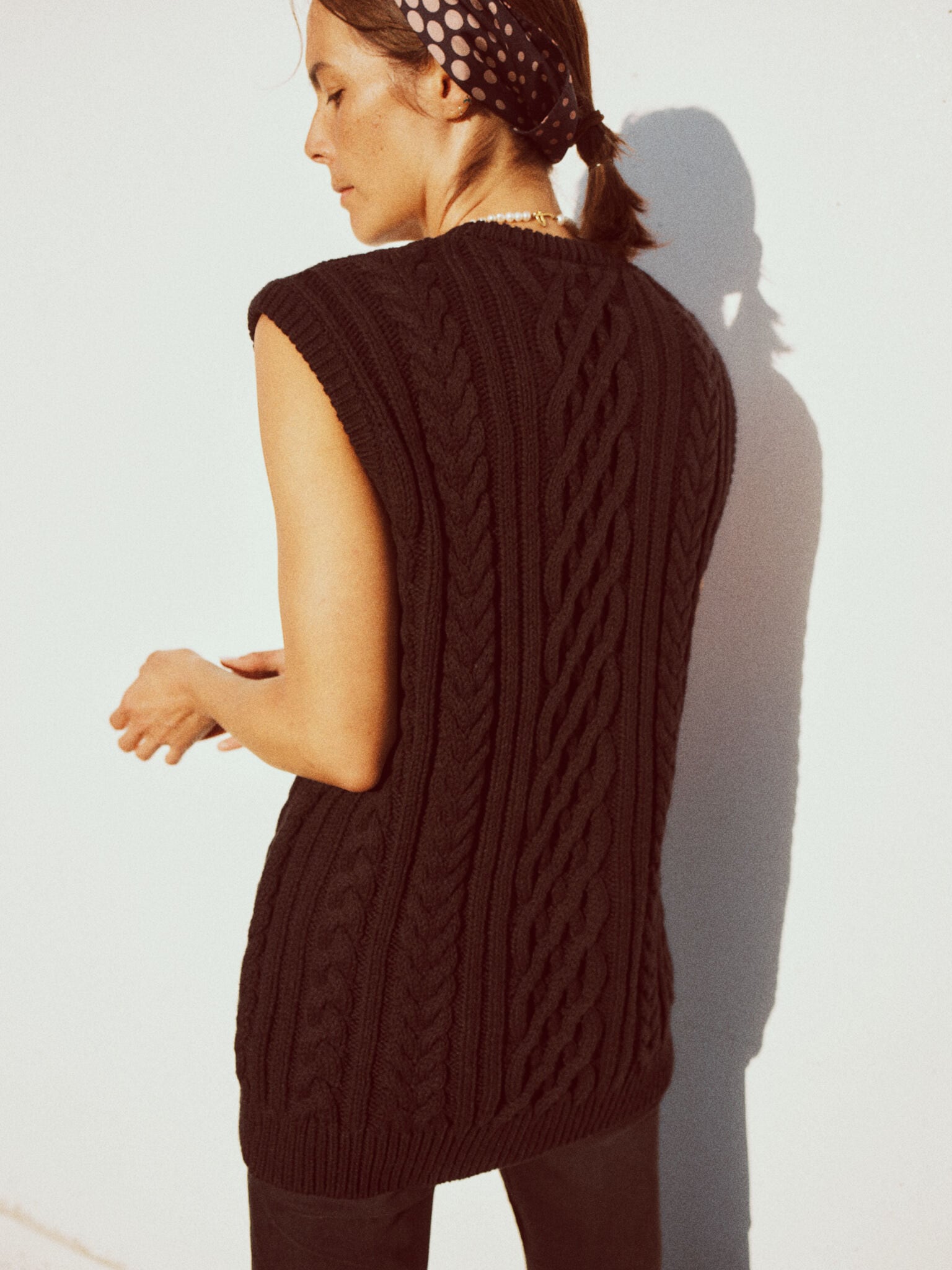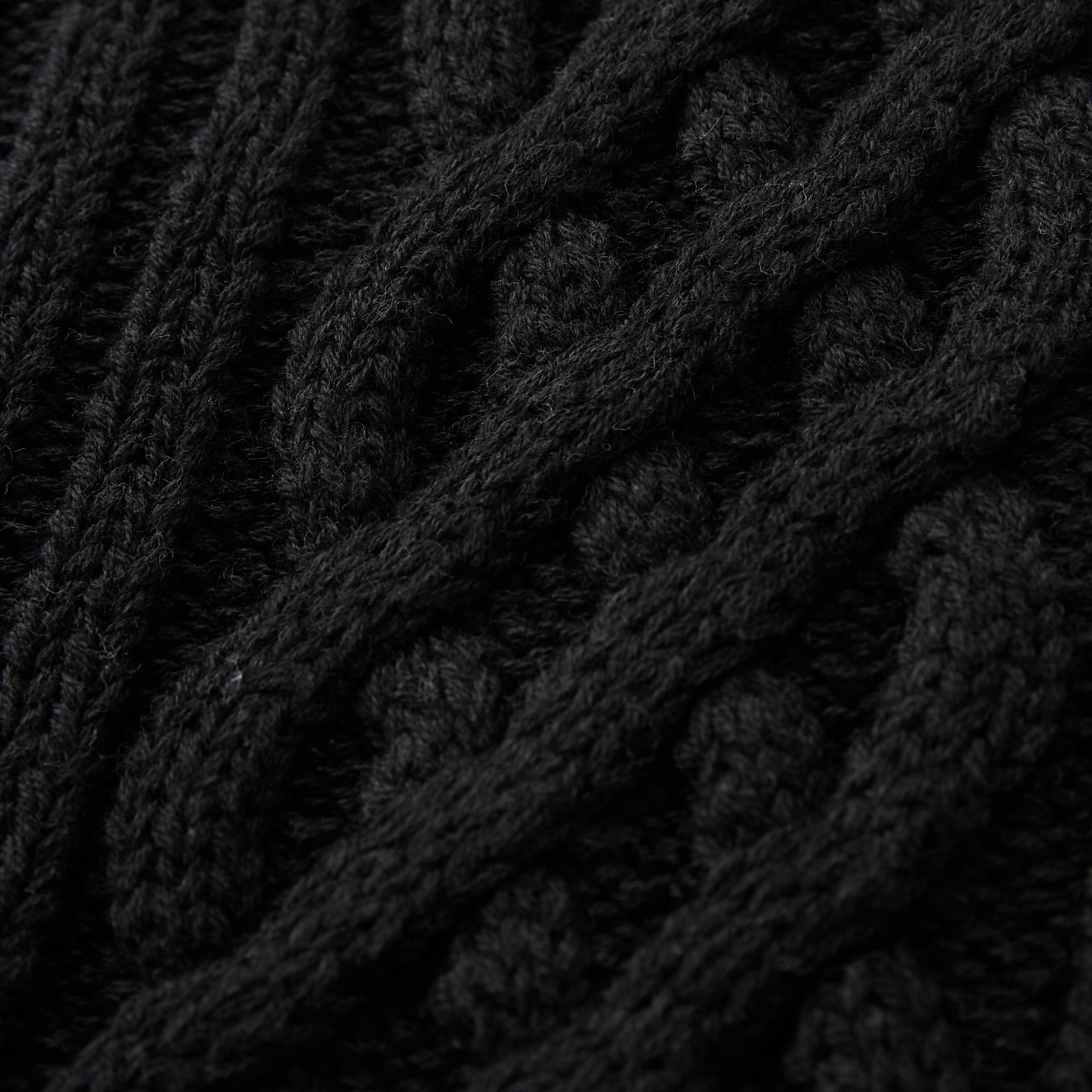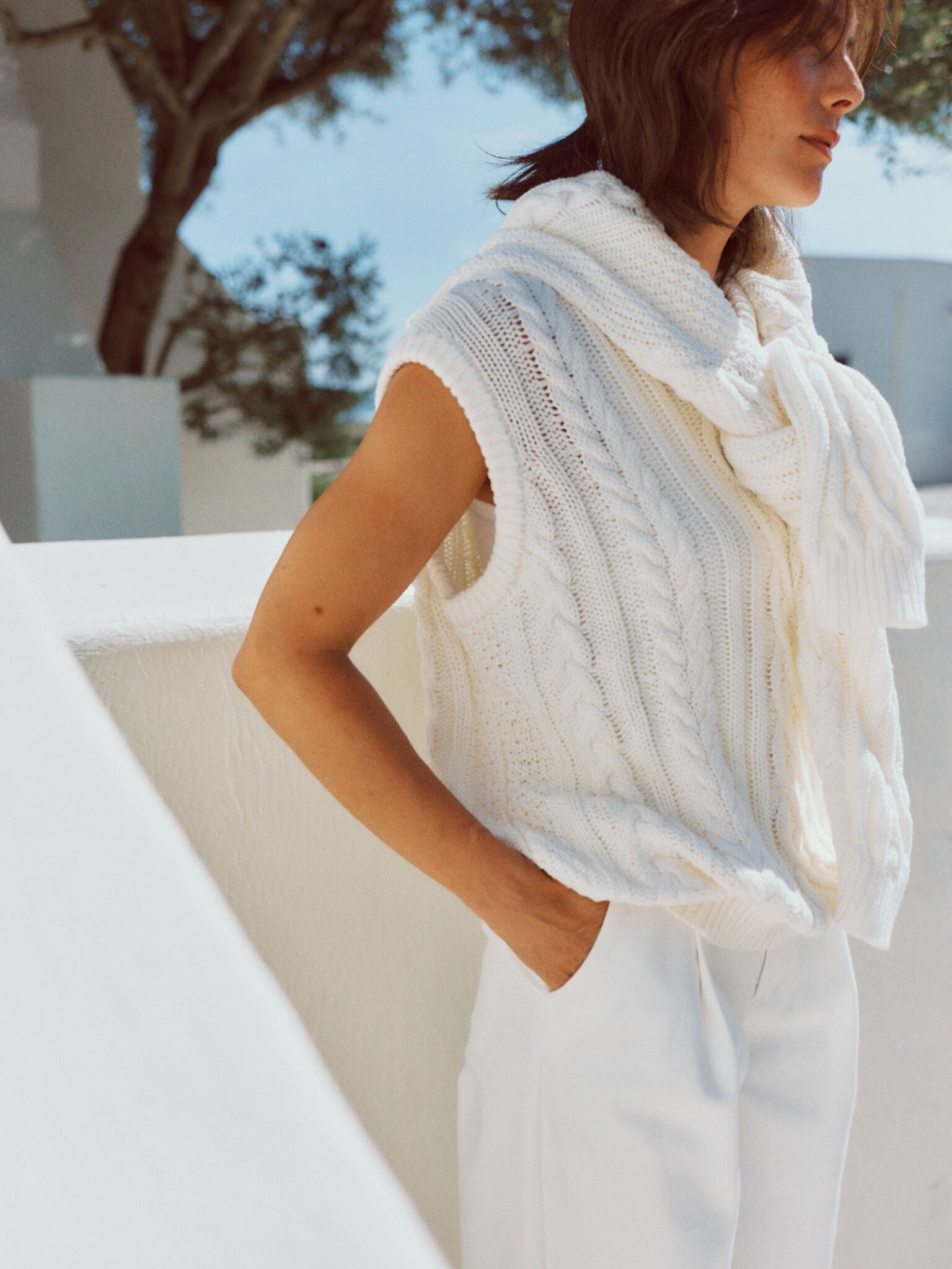 オーセンティックなケーブルニットは、クローゼットに一枚持っておきたいアイテム。シーズンレスに使っていただけるよう、コットン90%にカシミアとナイロンを5%ずつブレンドした糸で編み上げました。編み地にもこだわり、華のあるノスタルジックなケーブル編みに仕上げました。一枚でも着やすい浅めのVネックベストは、ヒップまで隠れる長めの丈。程よく体が泳ぐサイズ感で、コーディネートしやすいバランスとなっています。TNH HENRY JEANのようなワイドシルエットのボトムスに合わせたり、サテンのスカートに合わせるのも素敵。カラーはクリーンなホワイトとシャープなブラックの2色をご用意しました。トレンドに左右されることなく、シーズンレスに、そしてタイムレスに着こなしていただけるニットです。